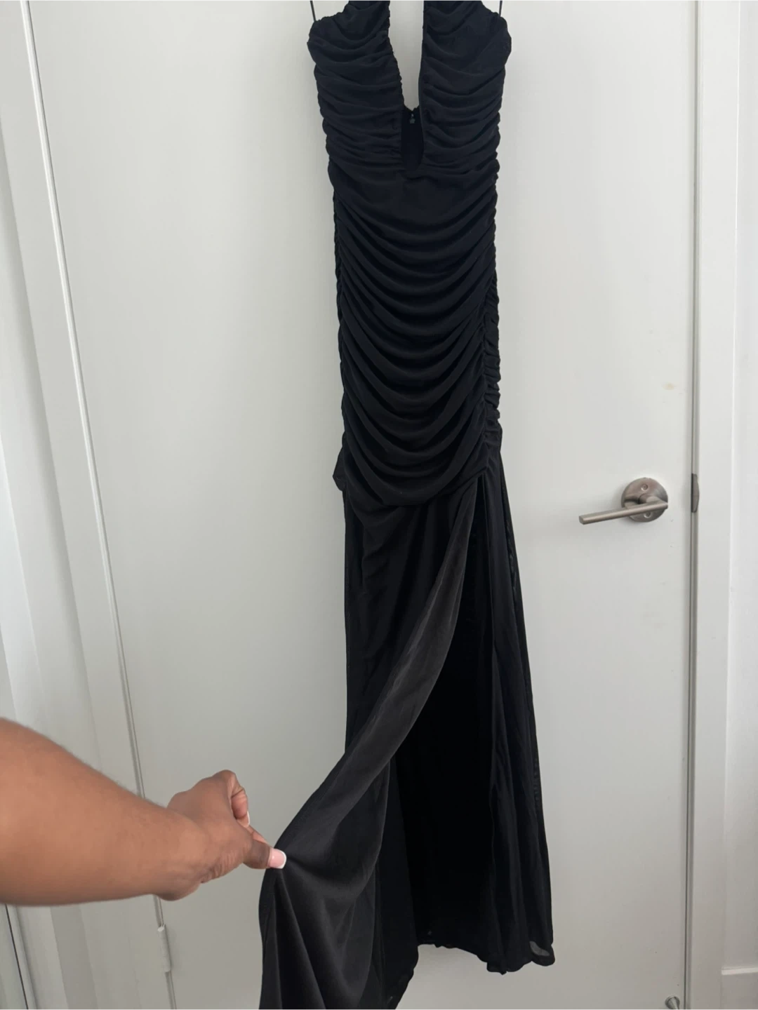 Selling a black halter maxi dress. It's in great condition and perfect for a night out or special occasion! The dress features a flattering halter neckline and a slit at the bottom.