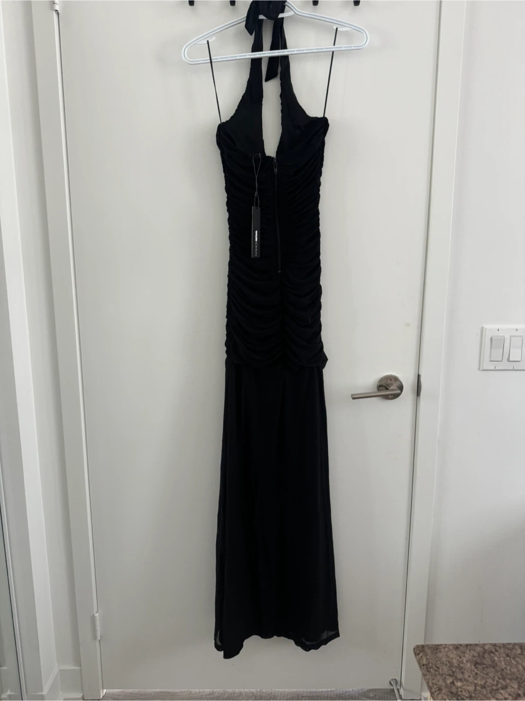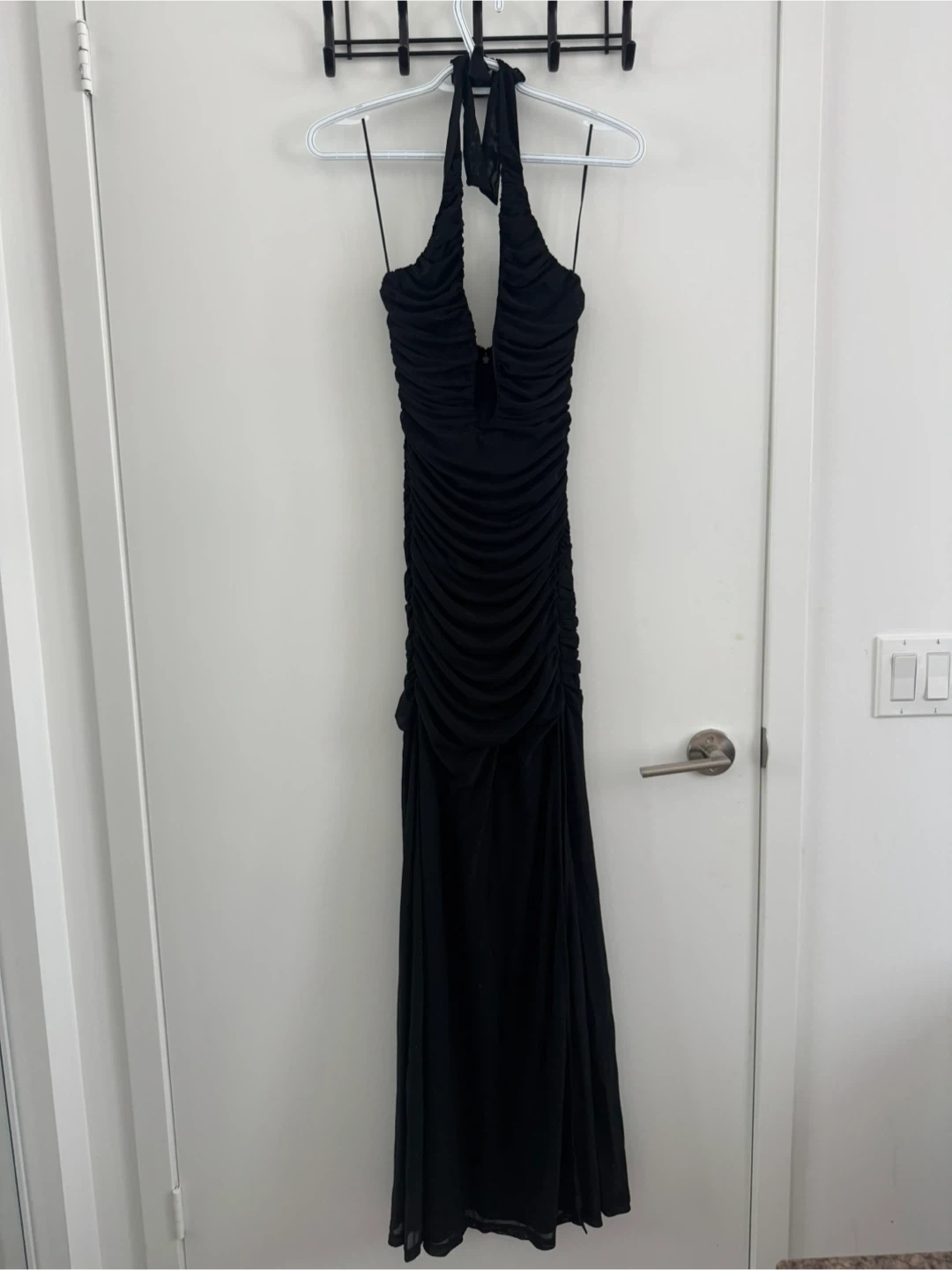 Selling a black halter maxi dress. It's in great condition and perfect for a night out or special occasion! The dress features a flattering halter neckline and a slit at the bottom.