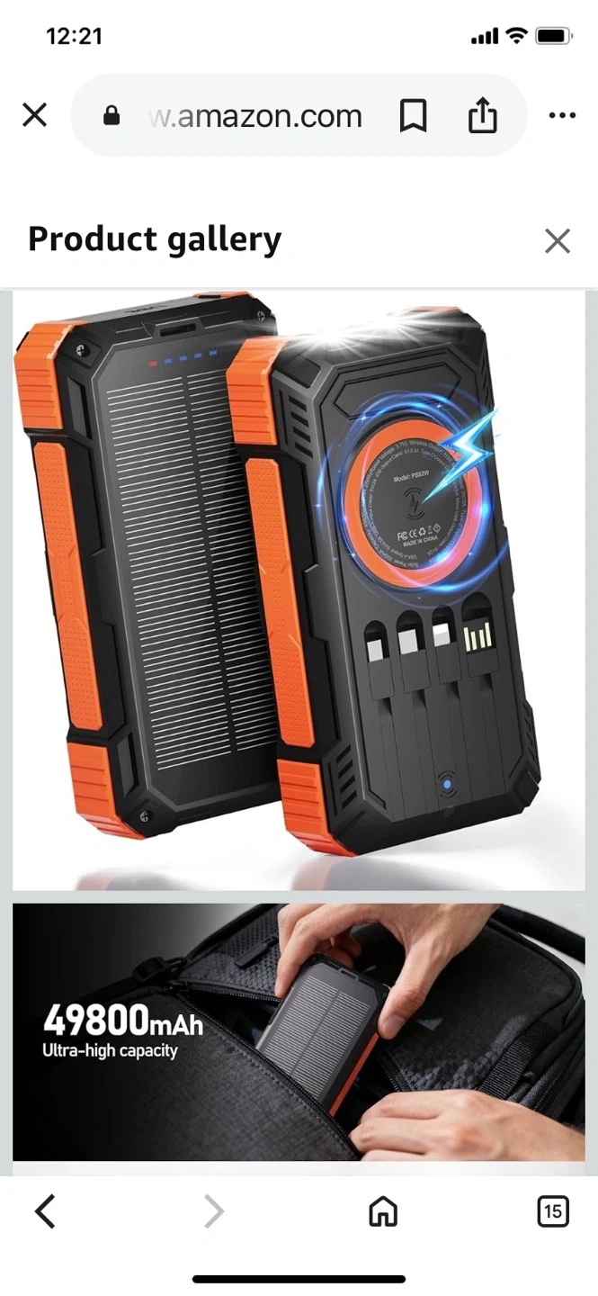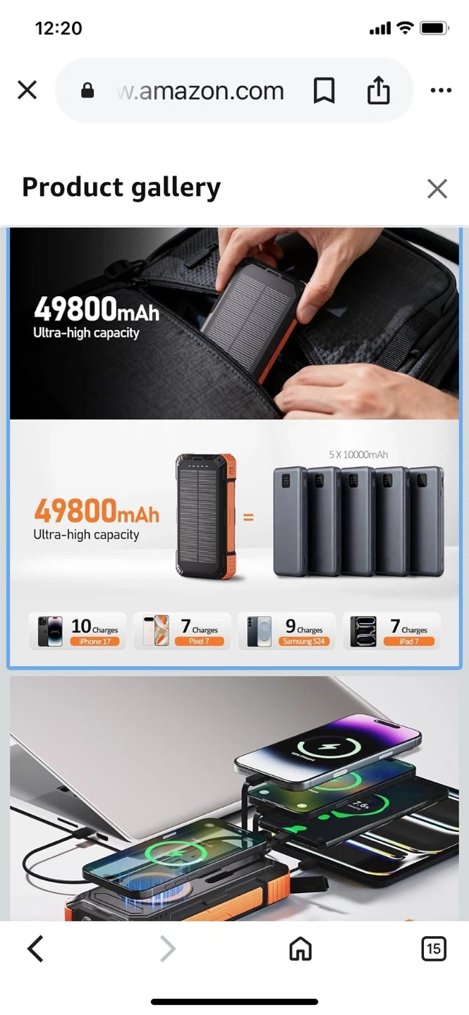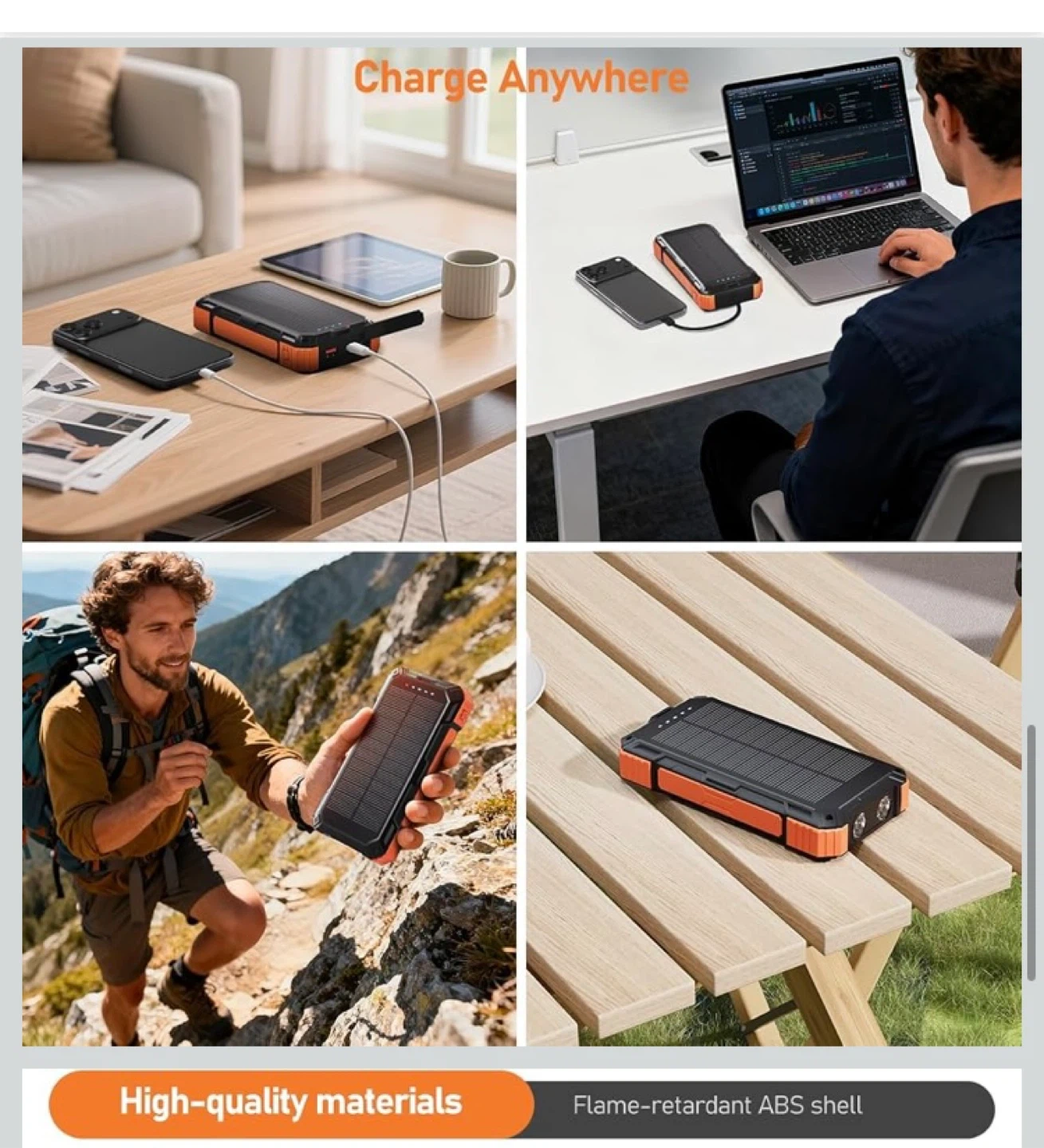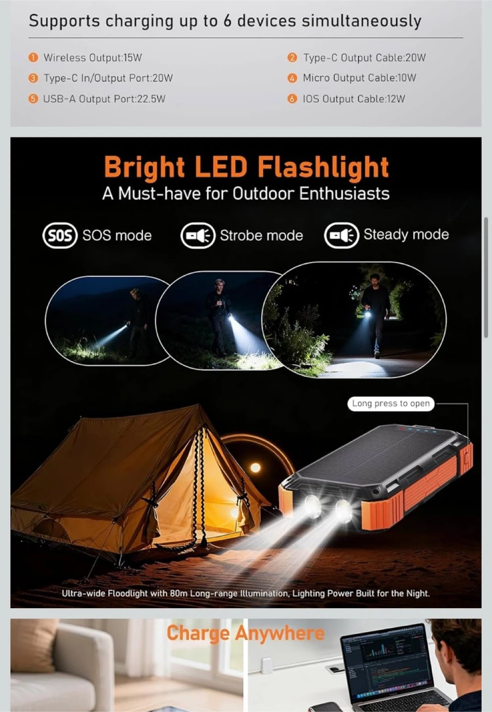 This portable charger has a 49800mAh ultra-high capacity and supports 15W wireless charging. It features a built-in dual LED flashlight with SOS and strobe modes. The charger has a solar panel for recharging and a USB-C port for fast charging. It can charge up to 6 devices simultaneously with various output ports.