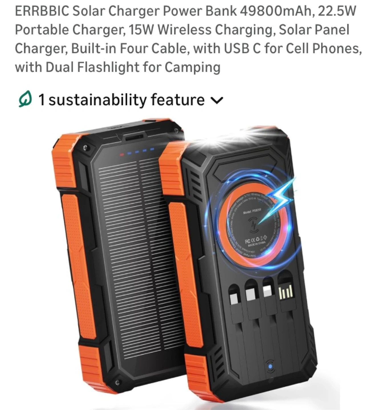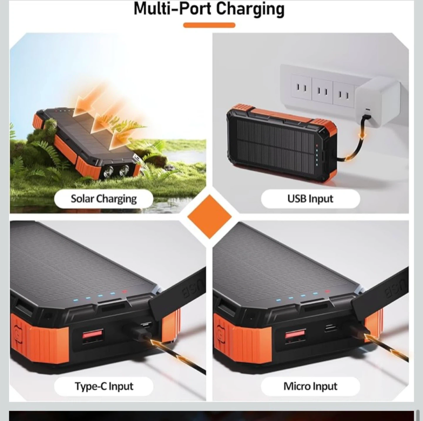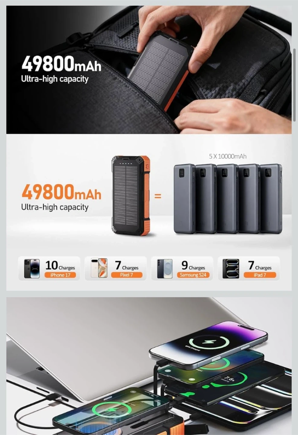 This portable charger has a 49800mAh ultra-high capacity and supports 15W wireless charging. It features a built-in dual LED flashlight with SOS and strobe modes. The charger has a solar panel for recharging and a USB-C port for fast charging. It can charge up to 6 devices simultaneously with various output ports.