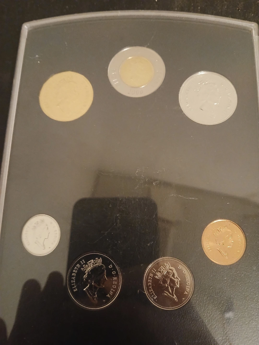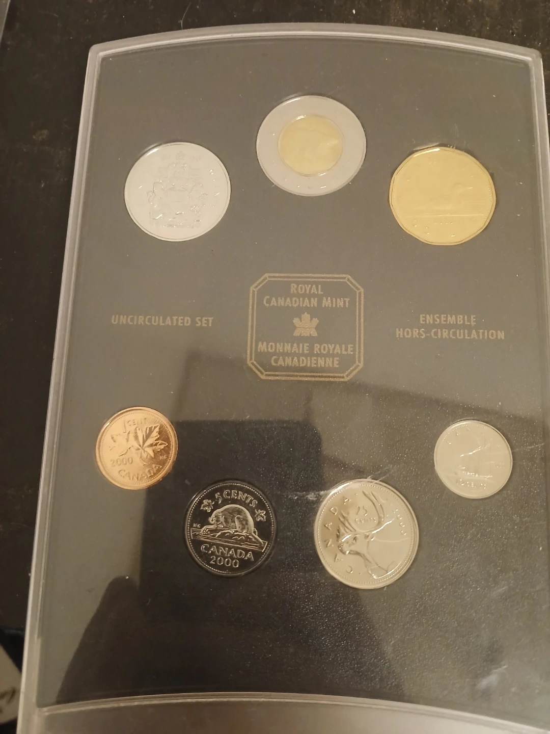 This is a Royal Canadian Mint uncirculated coin set. It includes various Canadian coins, showcasing their designs. These coins are from the year 2000.