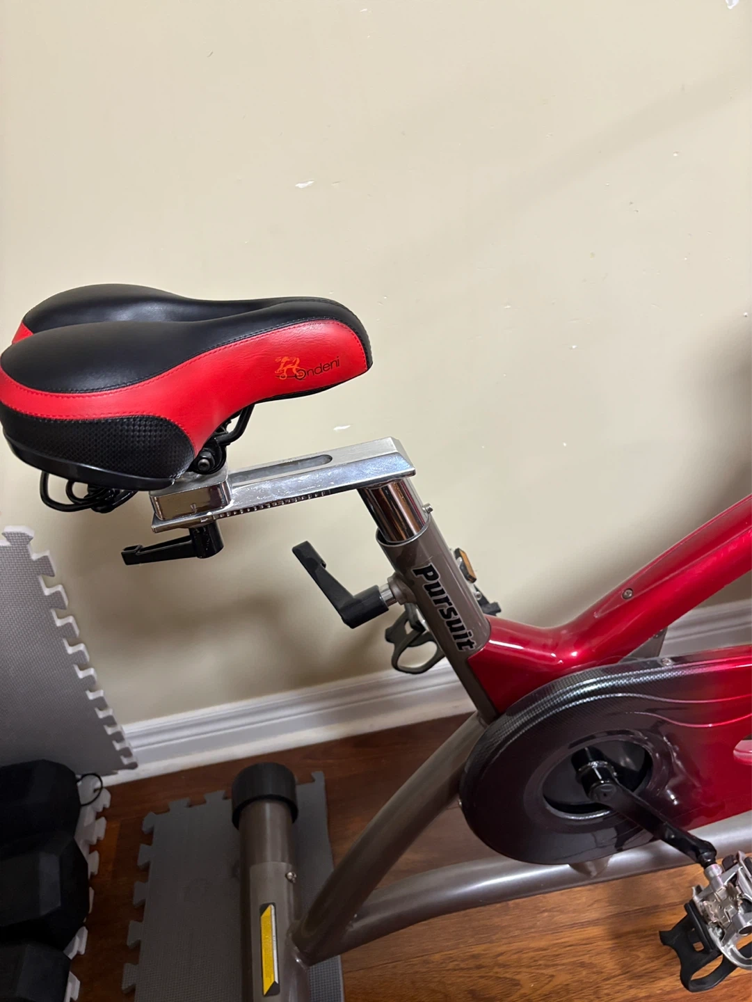 This is a Louis Garneau CS-2 indoor cycle. It has a red and silver frame with a black and red seat. Pedals include toe straps and reflectors. Suitable for home workouts! An excellent condition.