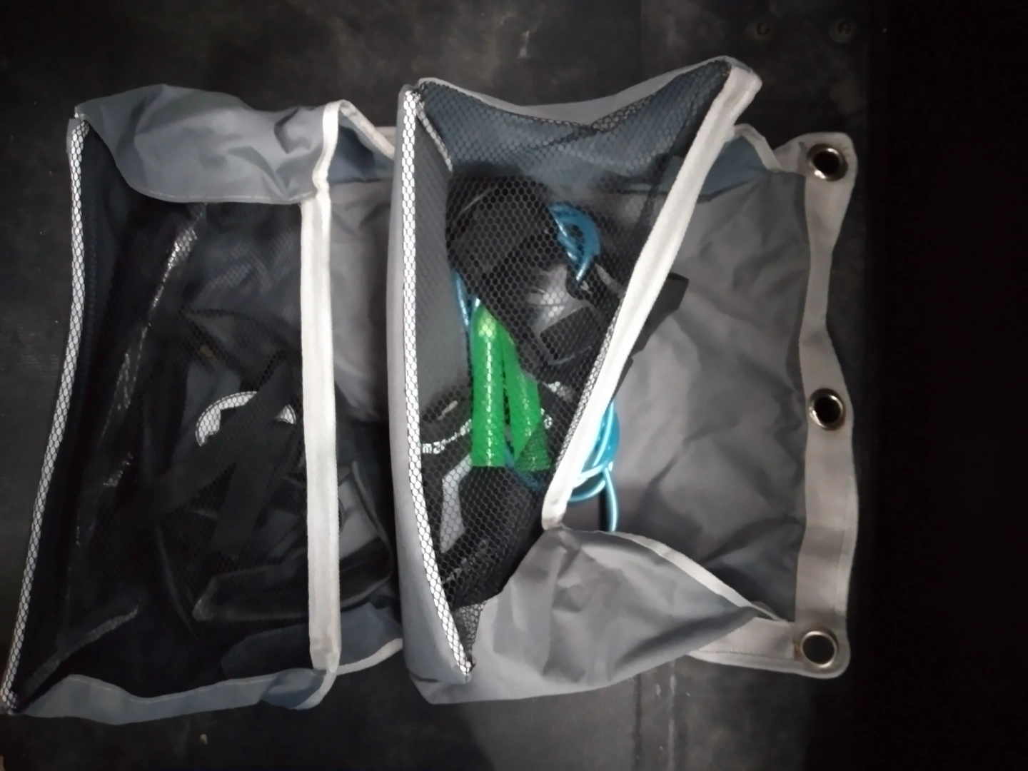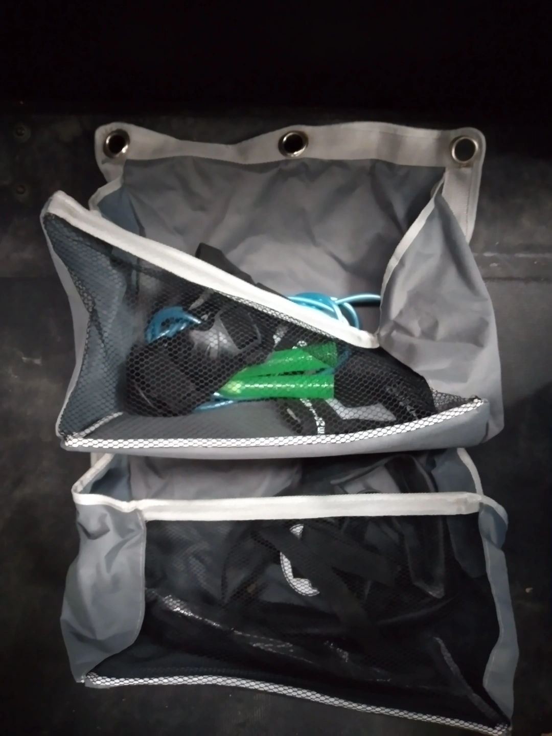 Storage organizer with multiple compartments. Features a mesh and grey design, white trimming, and eyelets at the corners. This organizer is perfect for storing small items neatly and tidily. Could be used in cars ๐, garage or anywhere.