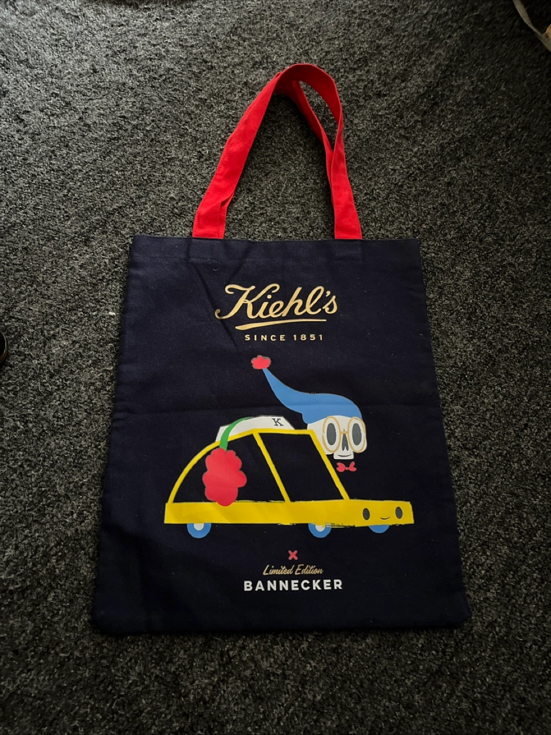 I'm selling a Kiehl's limited edition Bancker tote bag! It's a navy blue color with red handles and a fun car graphic. Perfect for carrying your everyday essentials!