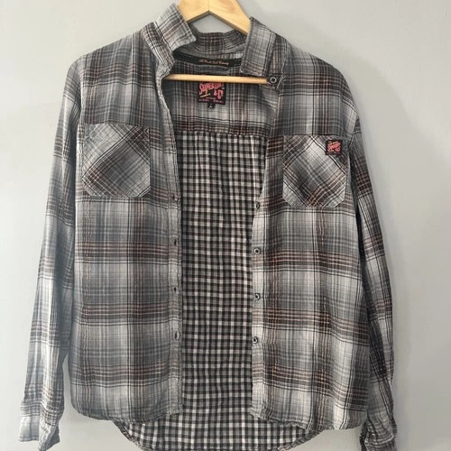This is a large, multicolor plaid button-up shirt for women from the Superdry & Co brand. It's a regular fit, perfect for casual or everyday wear. A stylish and comfortable addition to your wardrobe.