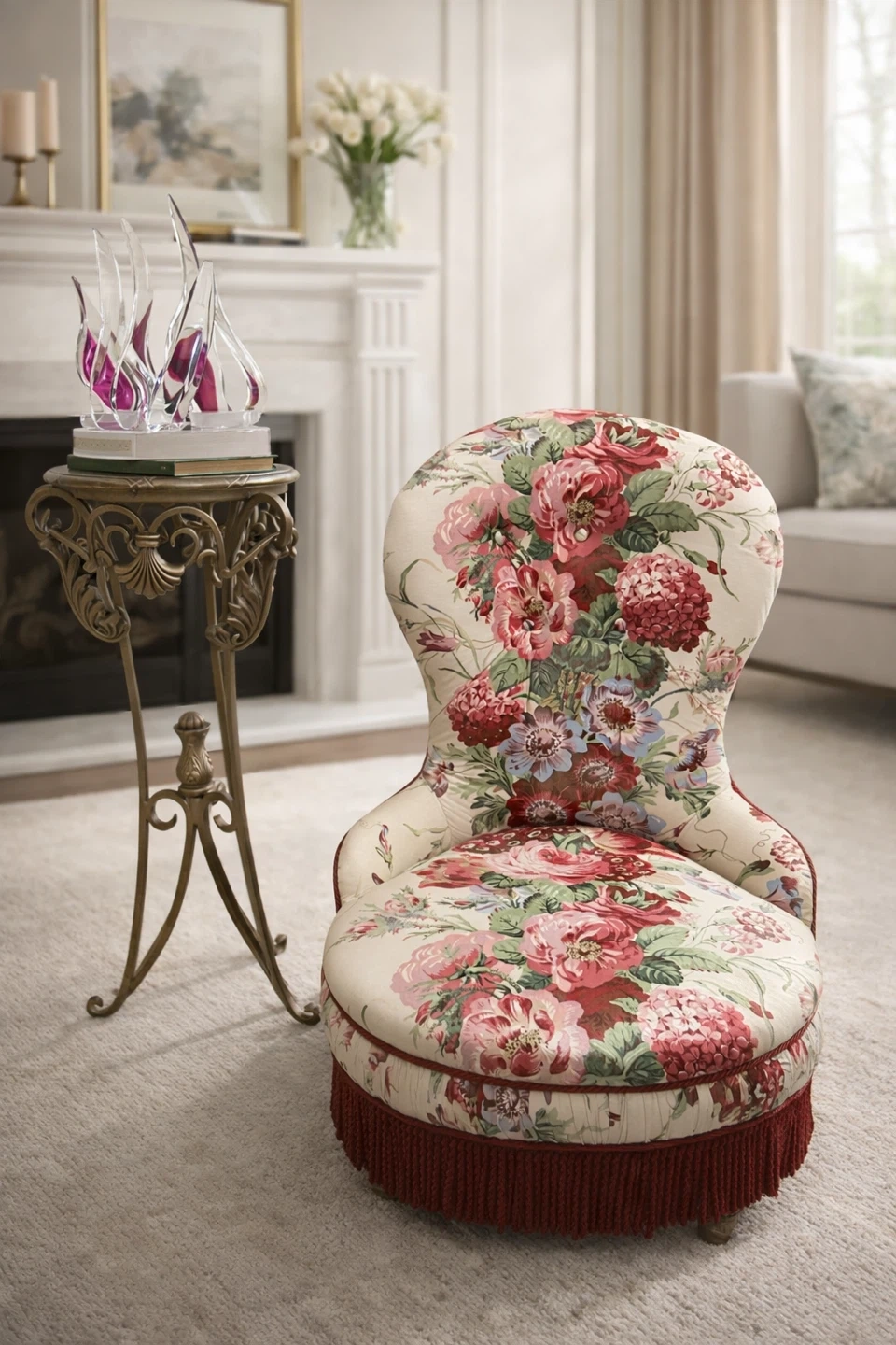 This charming accent chair features a beautiful vintage floral fabric. It has a rounded back and seat with a decorative red tassel skirt along the bottom. It's a lovely piece for adding a touch of old-fashioned style to any room.