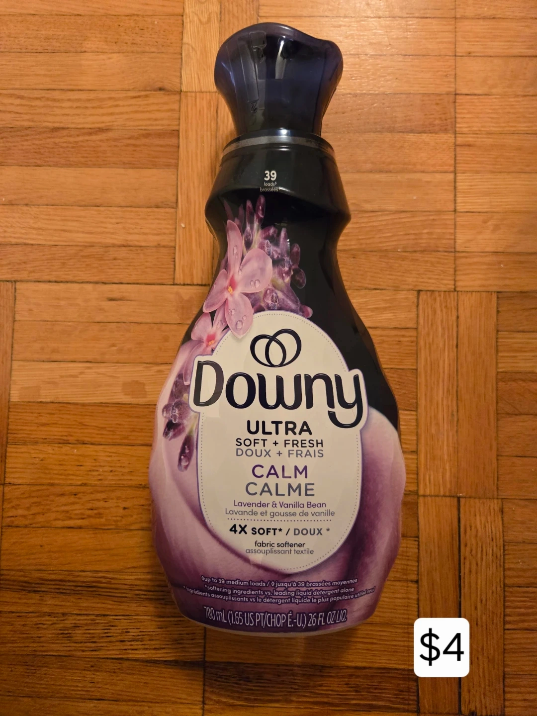 Downy Ultra fabric softener in Calm scent. It's Lavender & Vanilla Bean fragrance. This bottle contains 780 mL and makes up to 39 medium loads.