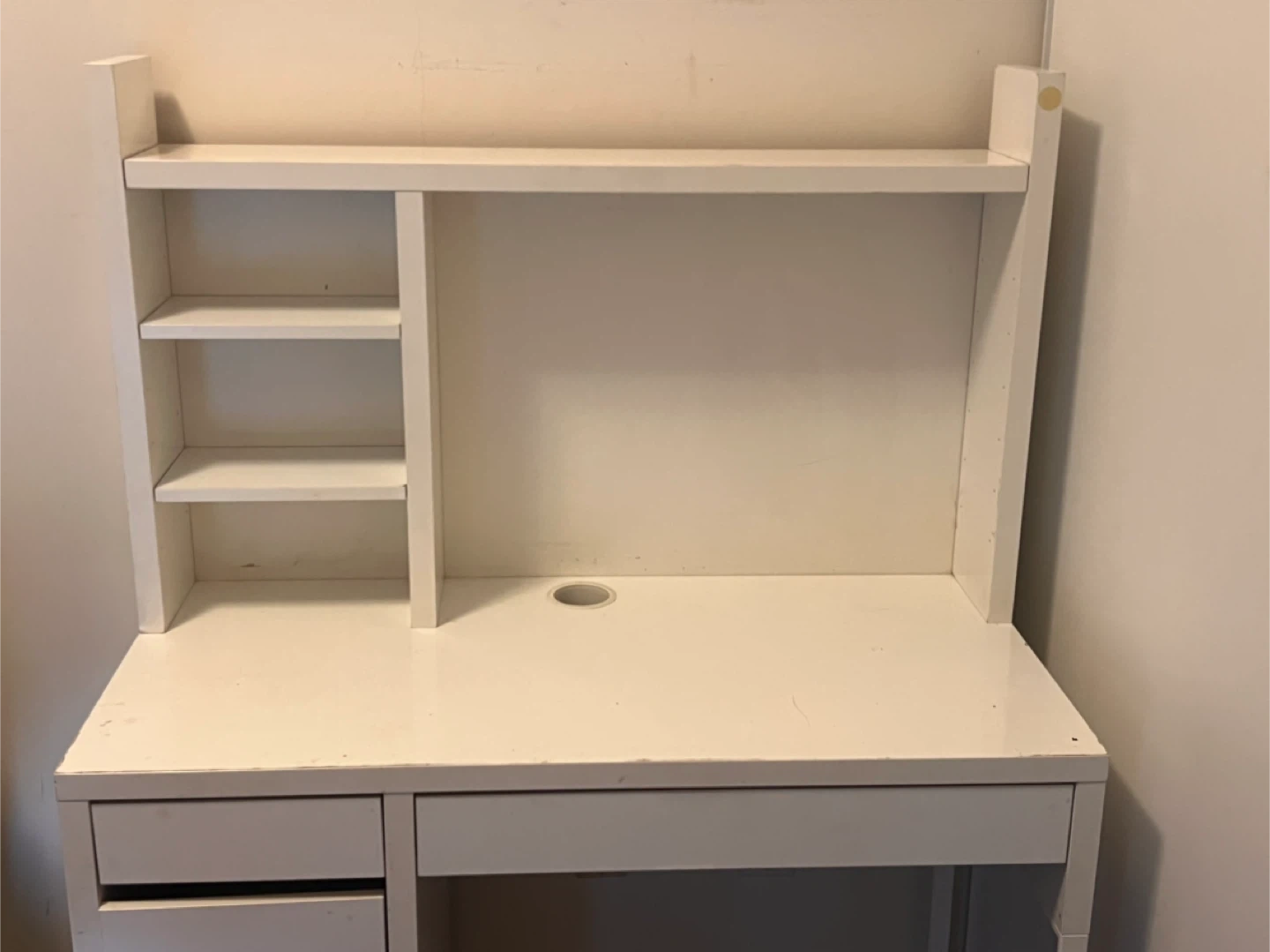 Selling a white desk. It's in great condition and perfect for a home office or study space. It has a drawer and a cabinet for storage.