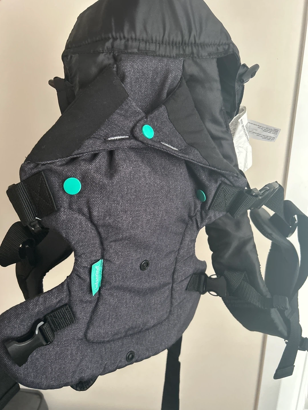 This Infantino baby carrier is dark grey with teal accents. It features adjustable straps for a secure fit. Perfect for hands-free carrying of your little one. For children between 8lb- 32lb