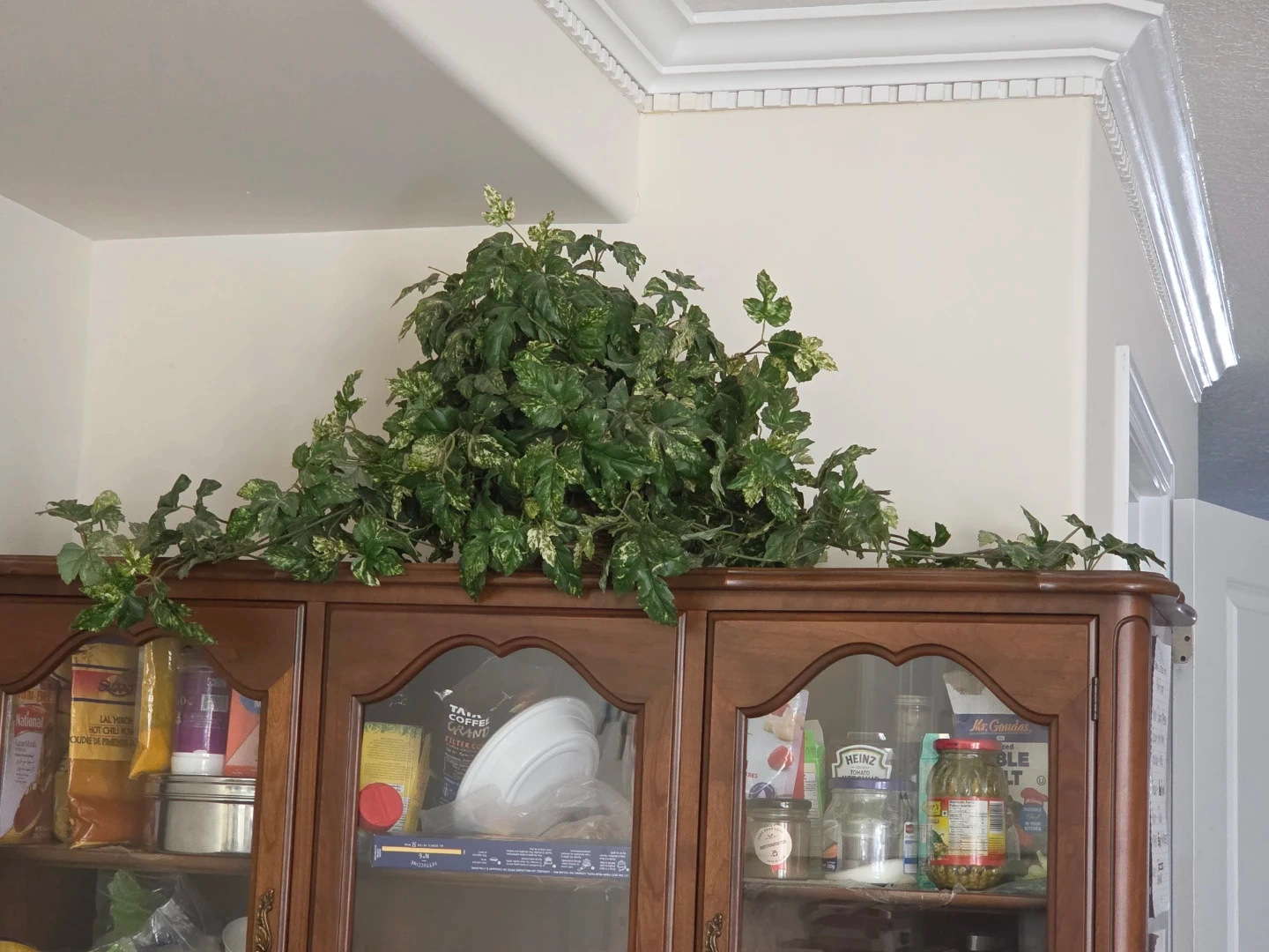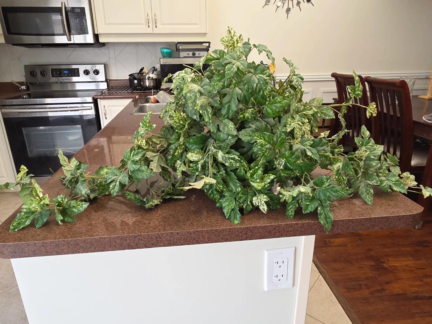 A lush artificial pothos plant with variegated green and white leaves. It's a generous size, perfect for draping over cabinets or shelves. Adds a touch of green to any room without the upkeep!