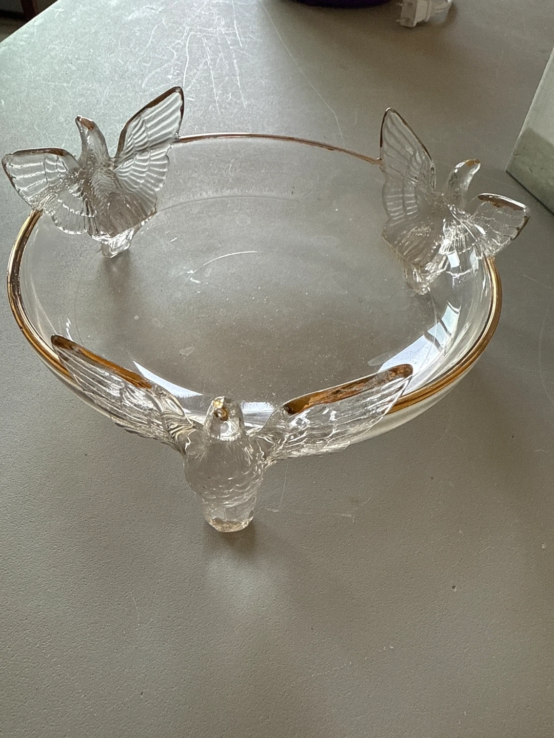 Selling a lovely vintage glass candy dish featuring three eagles. It's in great condition and would make a beautiful addition to any home!