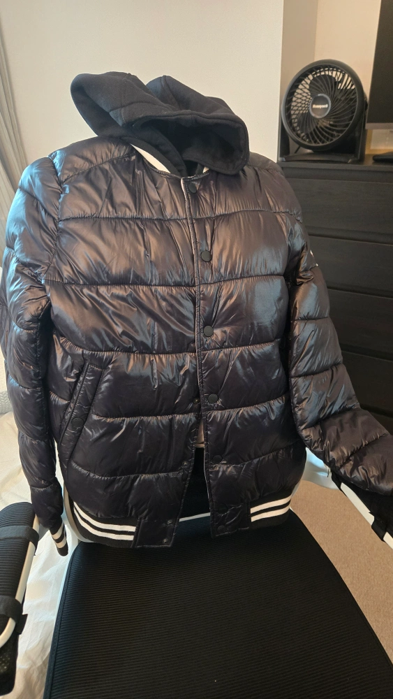 Selling a GUESS puffer jacket in size large! It's a stylish and warm jacket perfect for the colder weather. The jacket is in great condition and features the iconic GUESS logo on the sleeve. It's a bomber style with a hood and white stripes on the cuffs and waist.