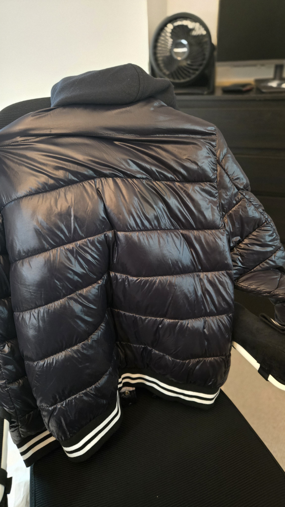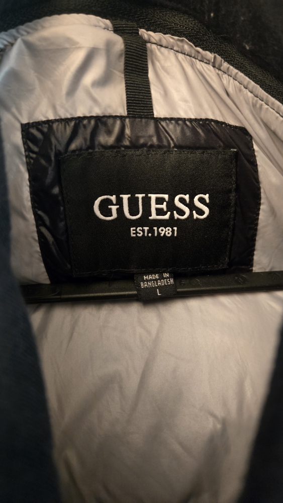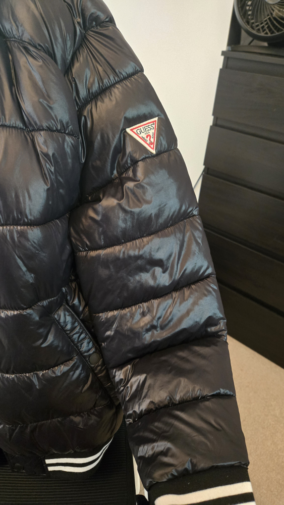 Selling a GUESS puffer jacket in size large! It's a stylish and warm jacket perfect for the colder weather. The jacket is in great condition and features the iconic GUESS logo on the sleeve. It's a bomber style with a hood and white stripes on the cuffs and waist.