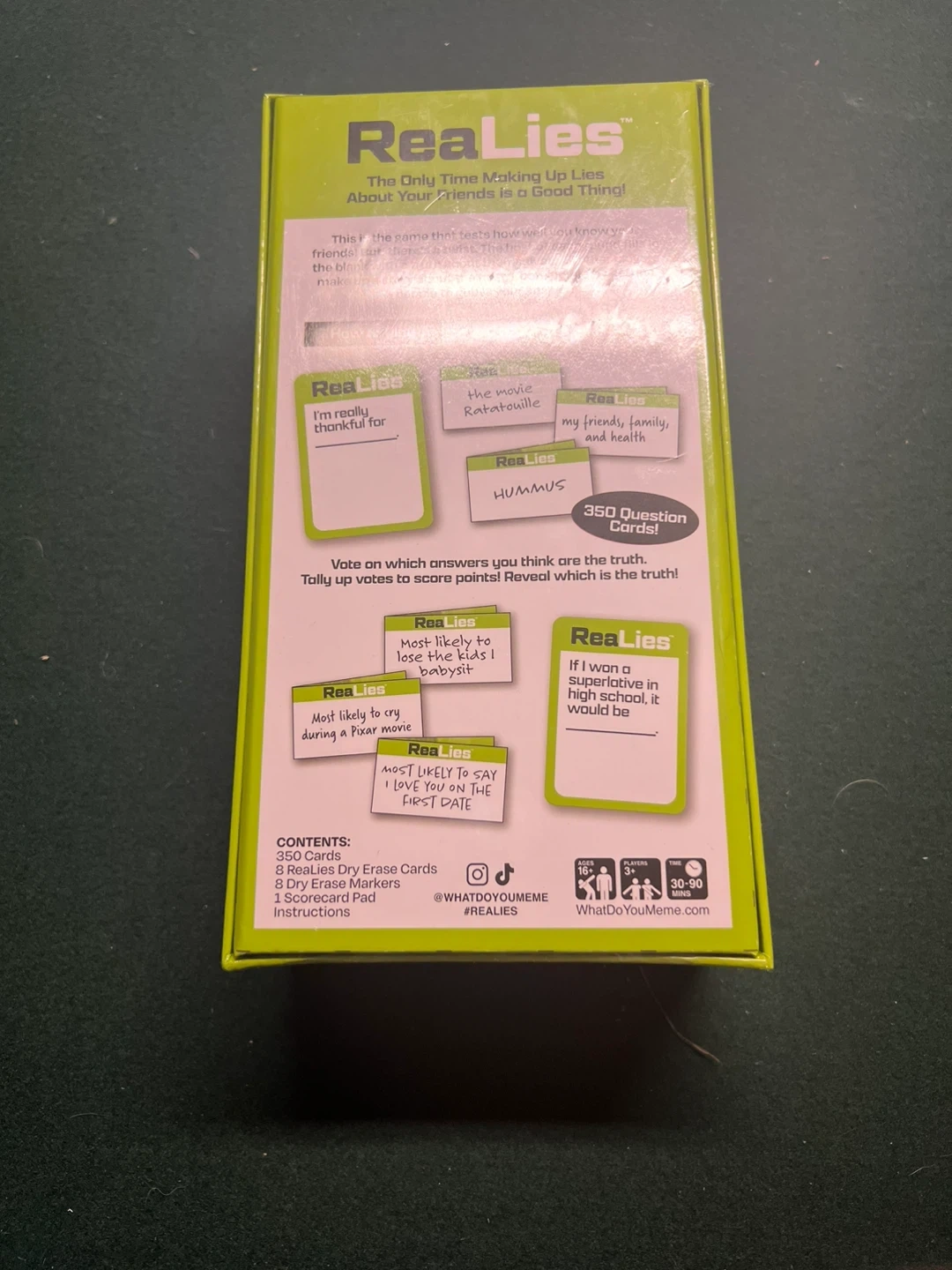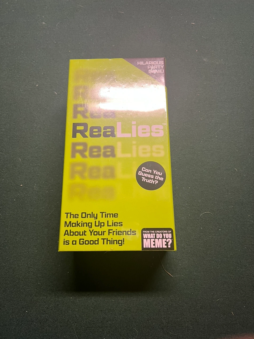 Real Lies is a hilarious party game where you guess the truth! It's the only time making up lies about your friends is a good thing. The game includes 350 question cards. It's great for game nights with friends and family!brand new
