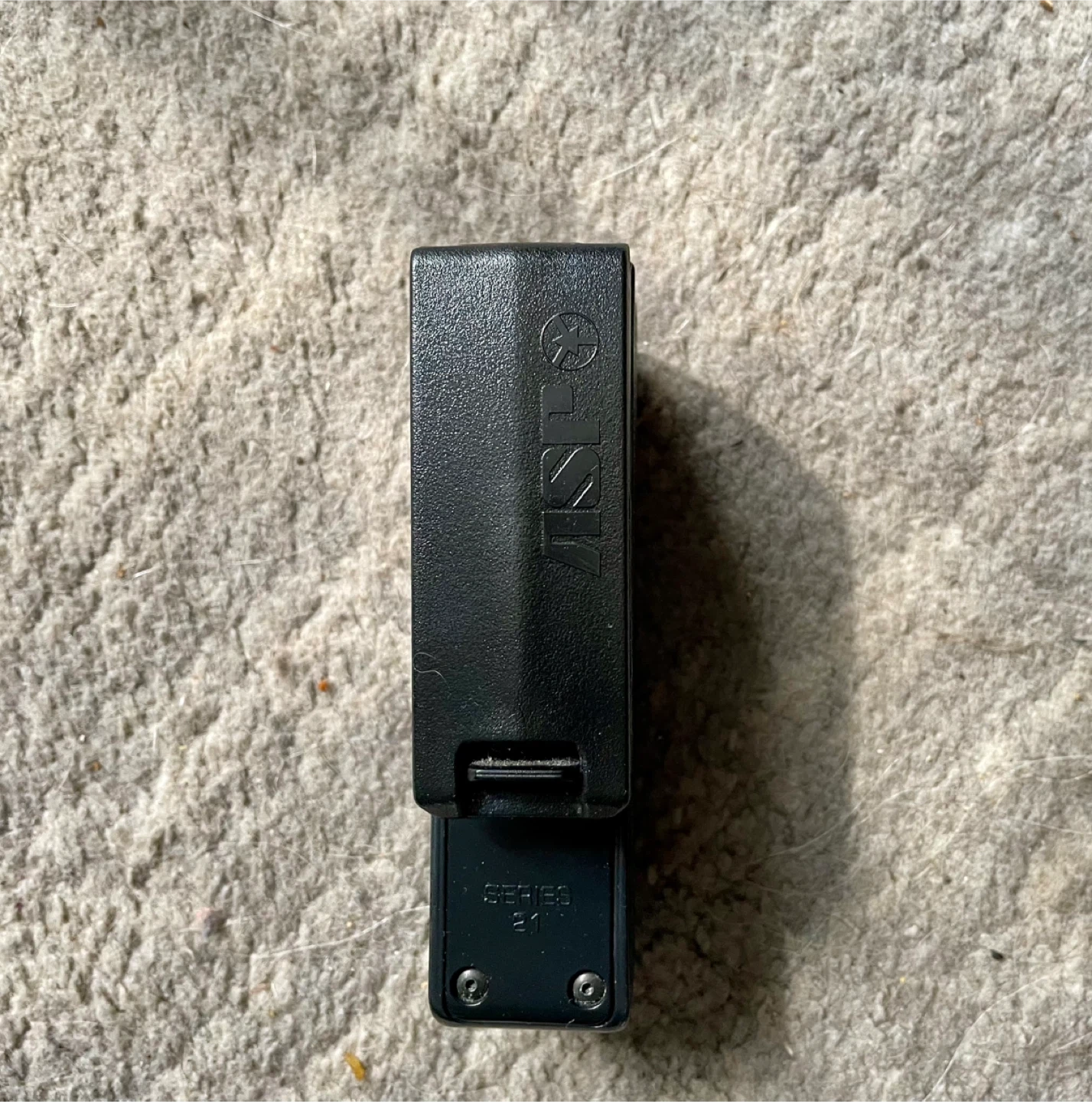 Black KISL Series 21 clip. It's a sturdy plastic clip, perfect for attaching gear. Serial number 21 visible. Great for your baton. Used but in good condition