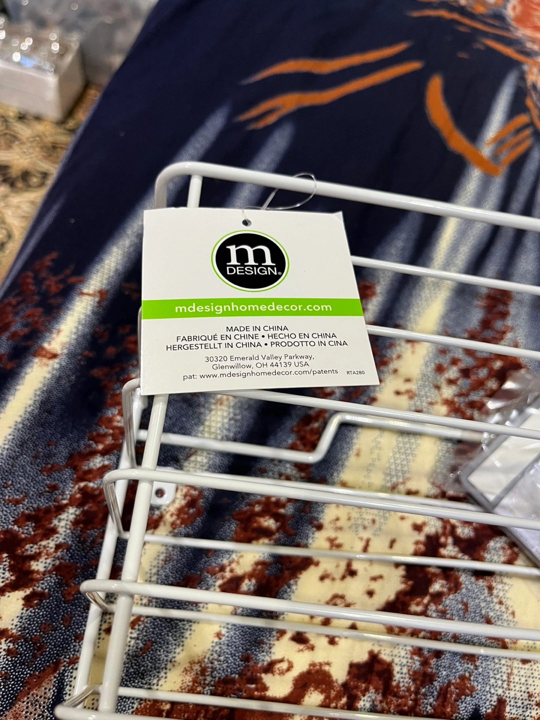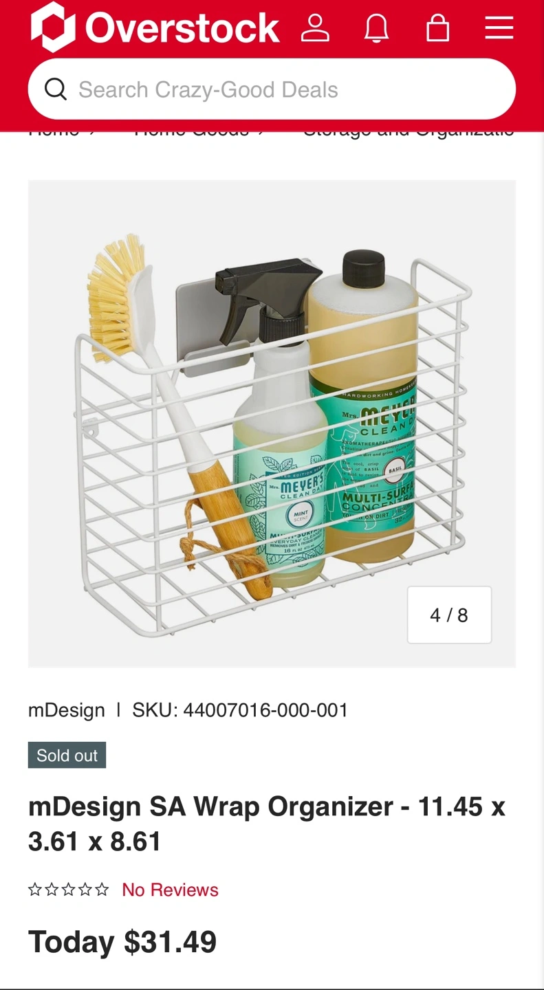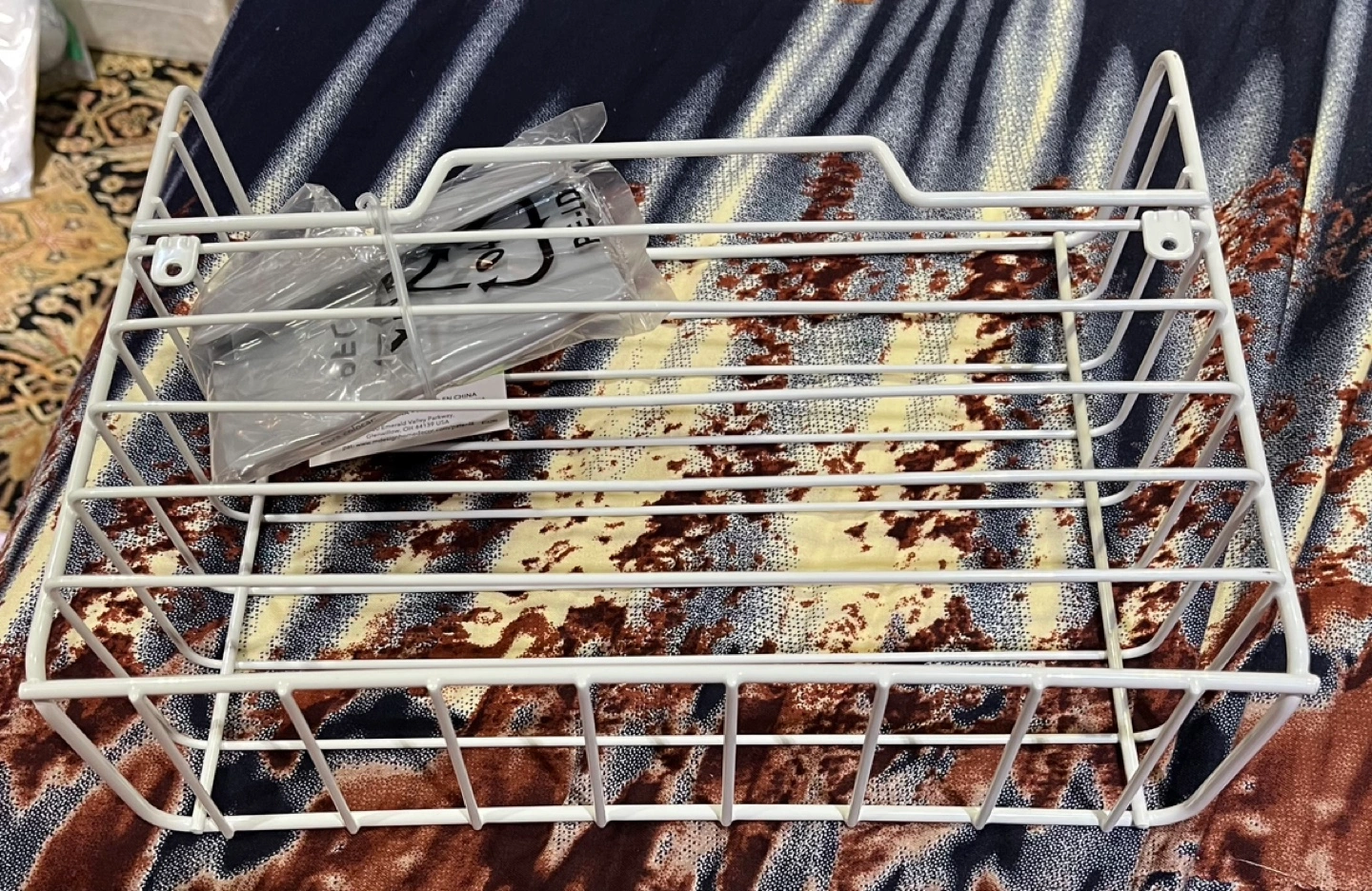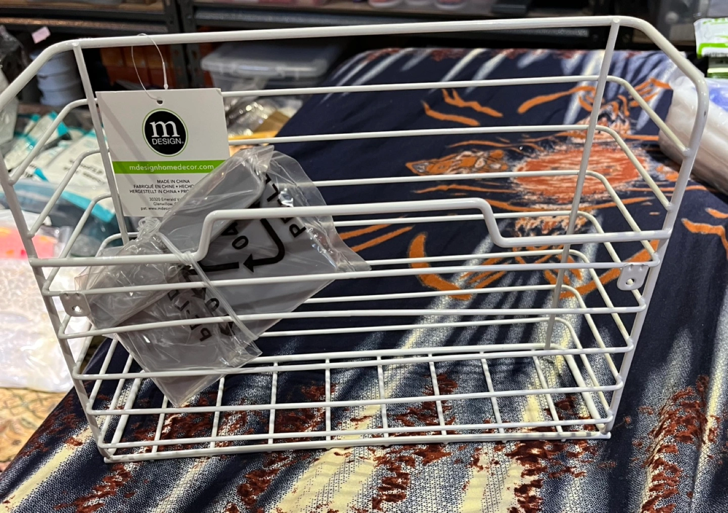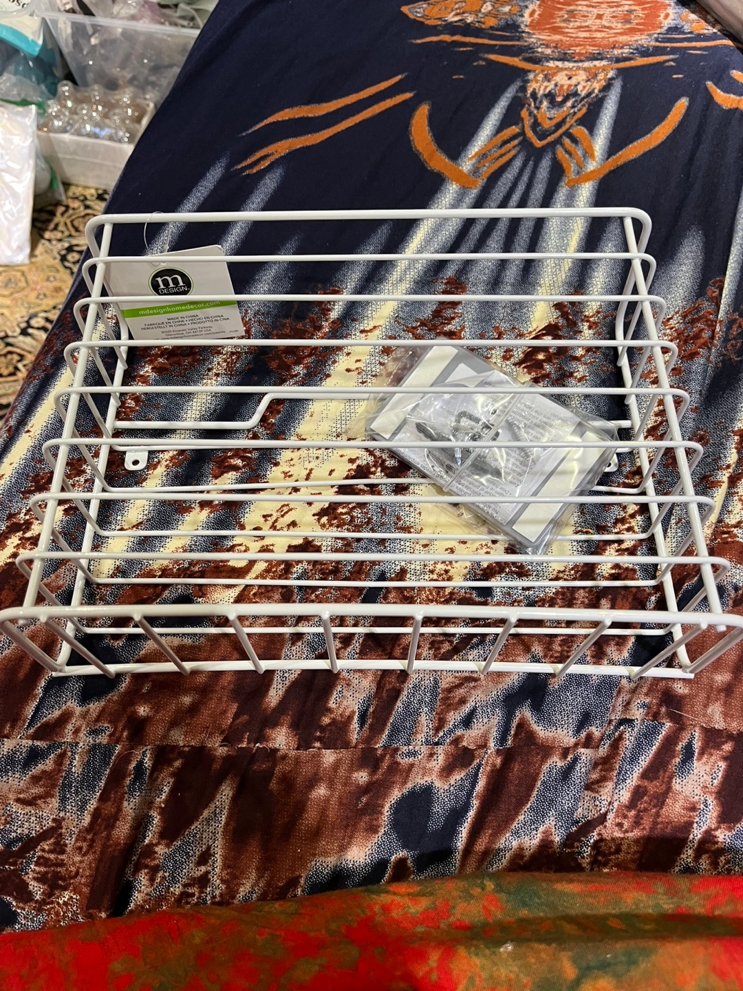 White wire organizer. Perfect for storing pantry items or cleaning supplies. Mounts easily under cabinets.