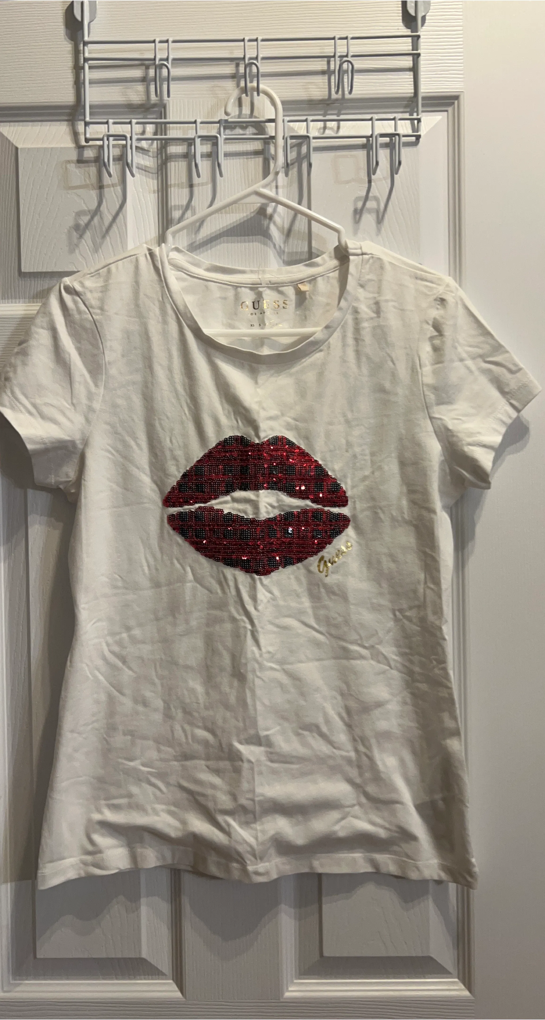 This white Guess t-shirt features a striking red sequin lip graphic. It's made from a comfortable cotton blend. The size tag indicates XS, but it fits like a small. This shirt has never been worn.