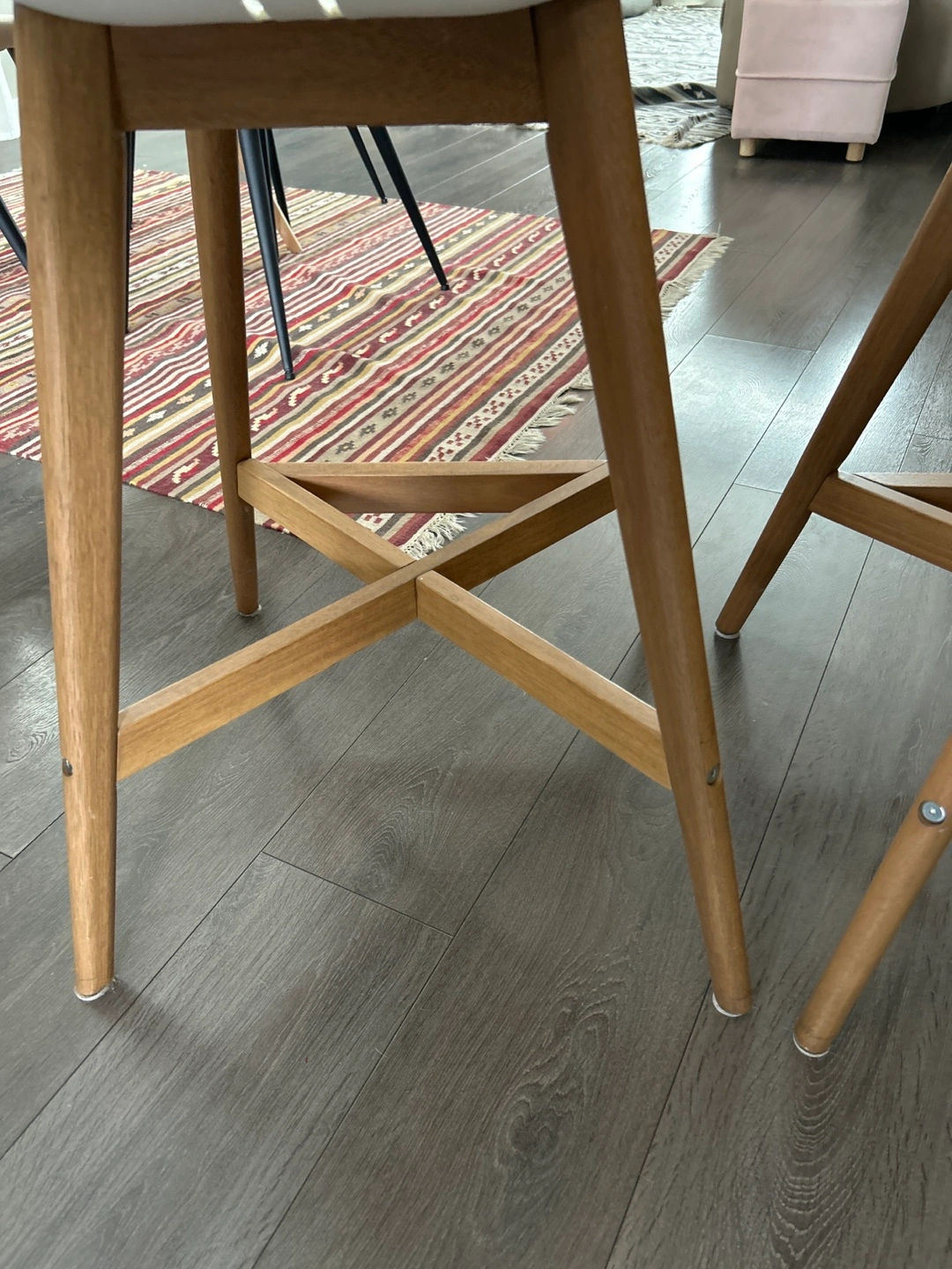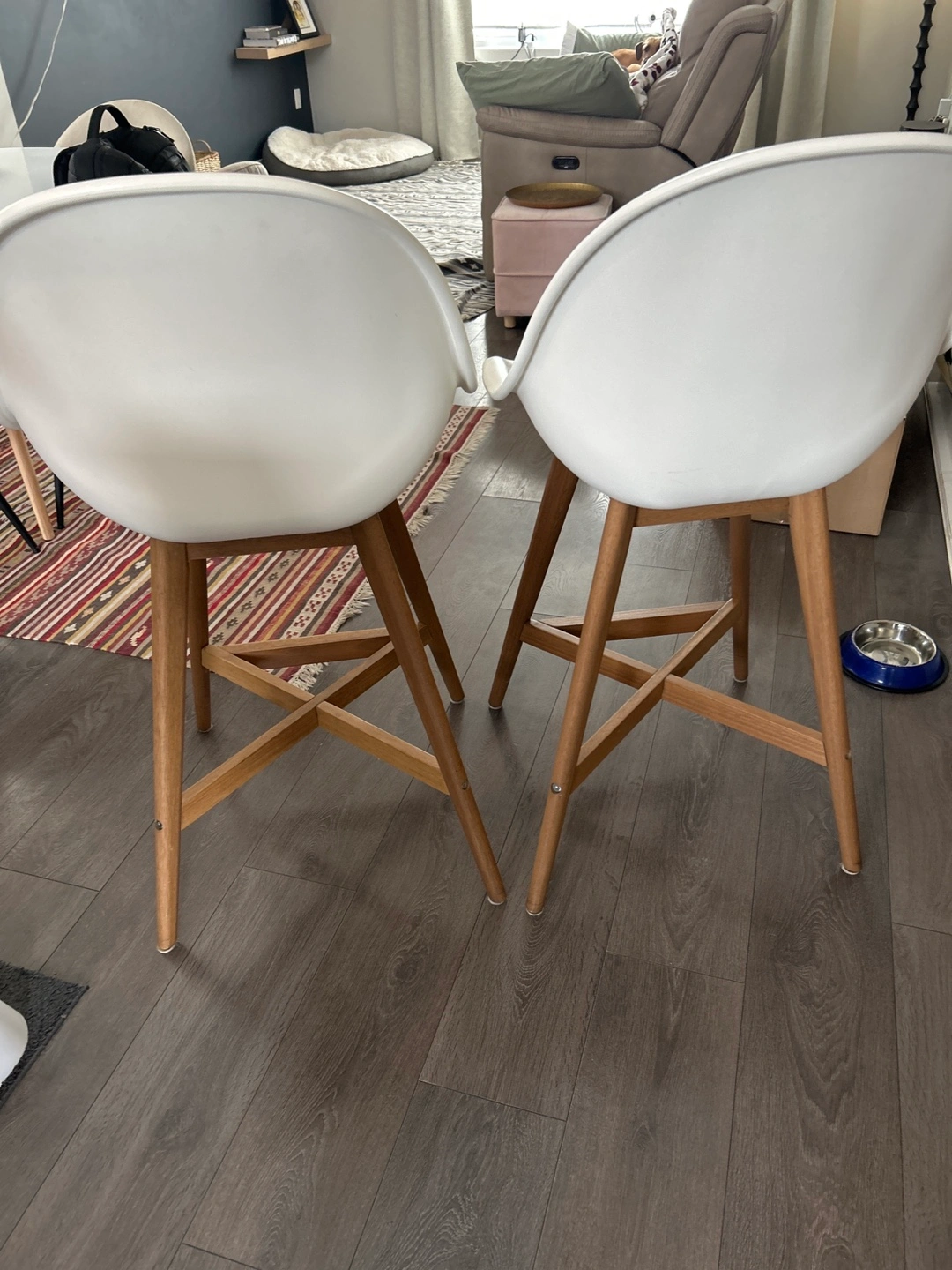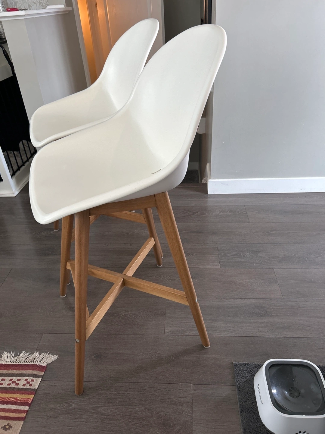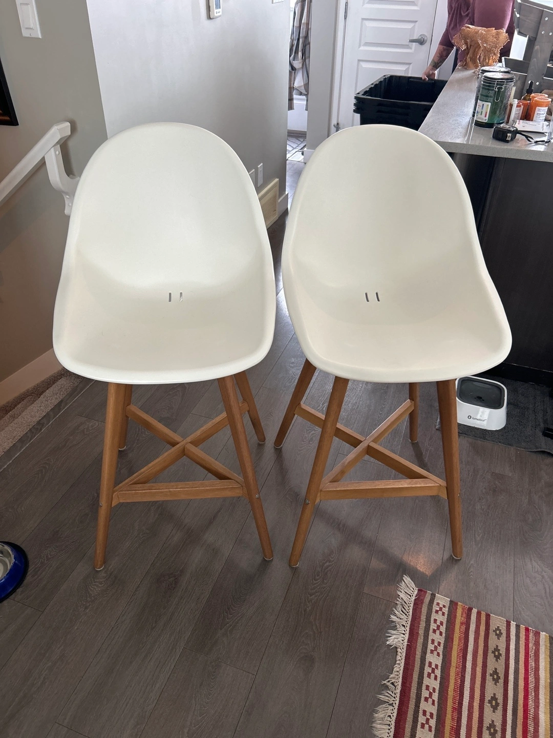 Set of two counter height stools. White plastic seats and light brown wooden legs. Simple, modern design. Good condition.