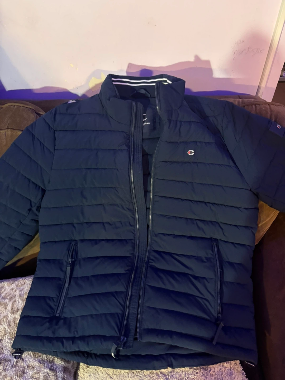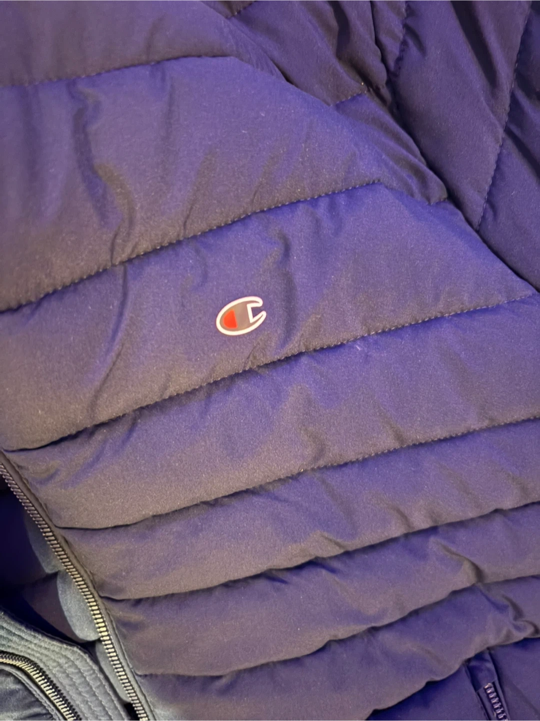 Champion puffer jacket in navy blue. It's a size medium. Features a full zip front and pockets.