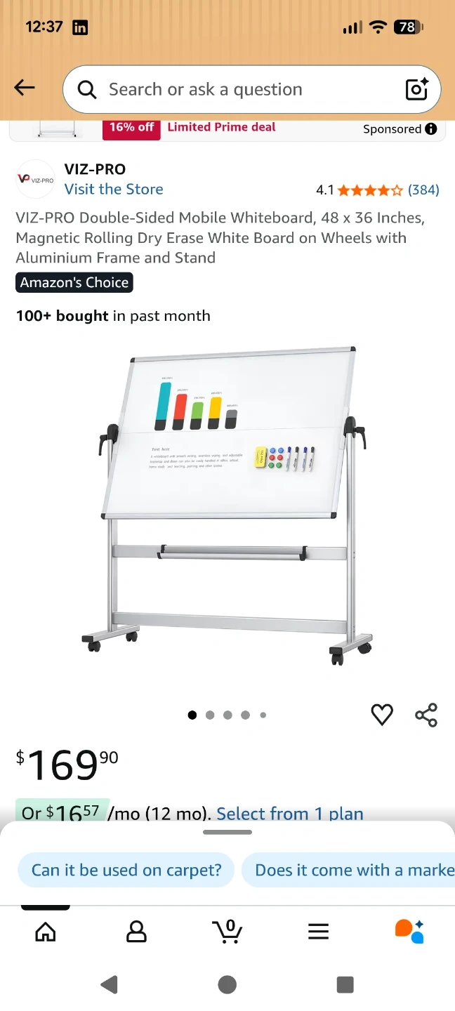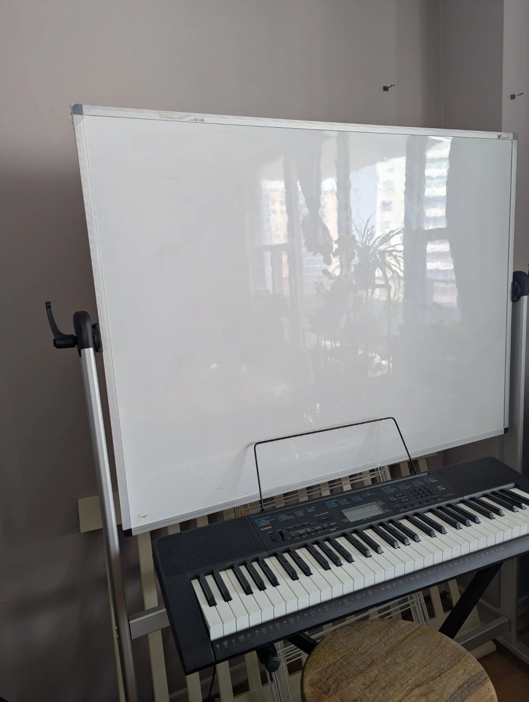 This VIZ-PRO mobile whiteboard is double-sided and magnetic. It comes with an aluminium frame and stand with wheels for easy movement. The whiteboard dimensions are 48 x 36 inches. It's great for presentations and brainstorming sessions!