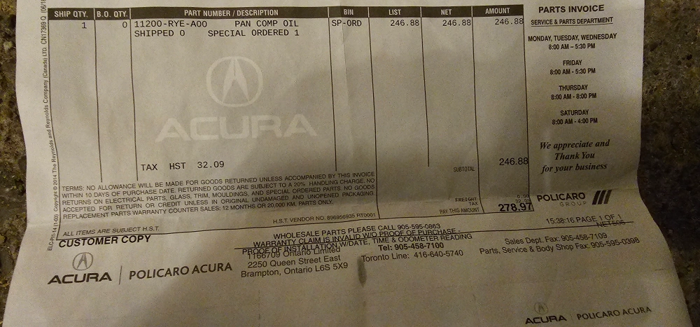 Selling a brand new Acura 11200-RYE-A00 oil pan for 2008 Acura TL Type S, along with Hondabond HT. The original invoice shows a price of $246.88 for the pan.