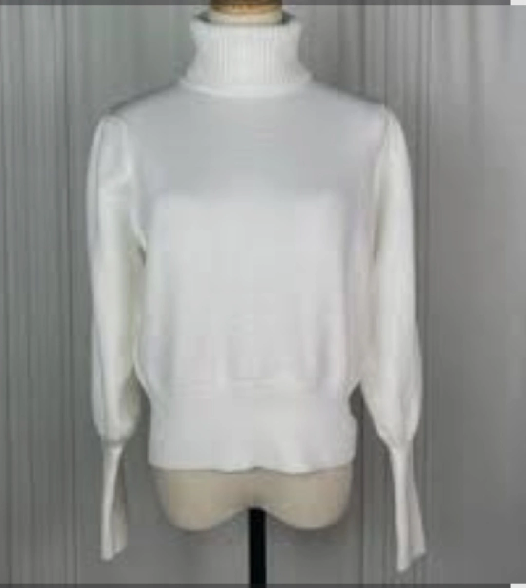 The sweater has unique puff sleeves, giving it an elegant and feminine touch. It can be found on several retail sites and is sometimes available in a "winter white" color.