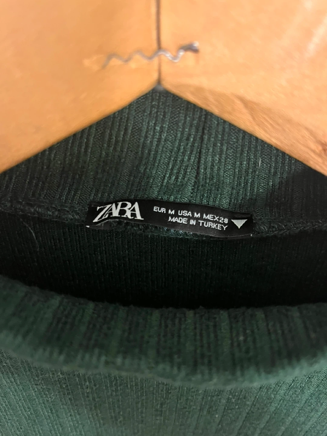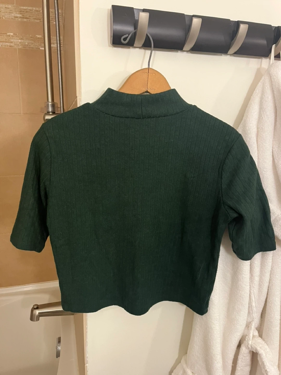 Dark green ribbed mock neck top from Zara. Cropped with short sleeves. Size medium. Good for layering or wearing on its own! Too short for me (I font like to show my belly button!).