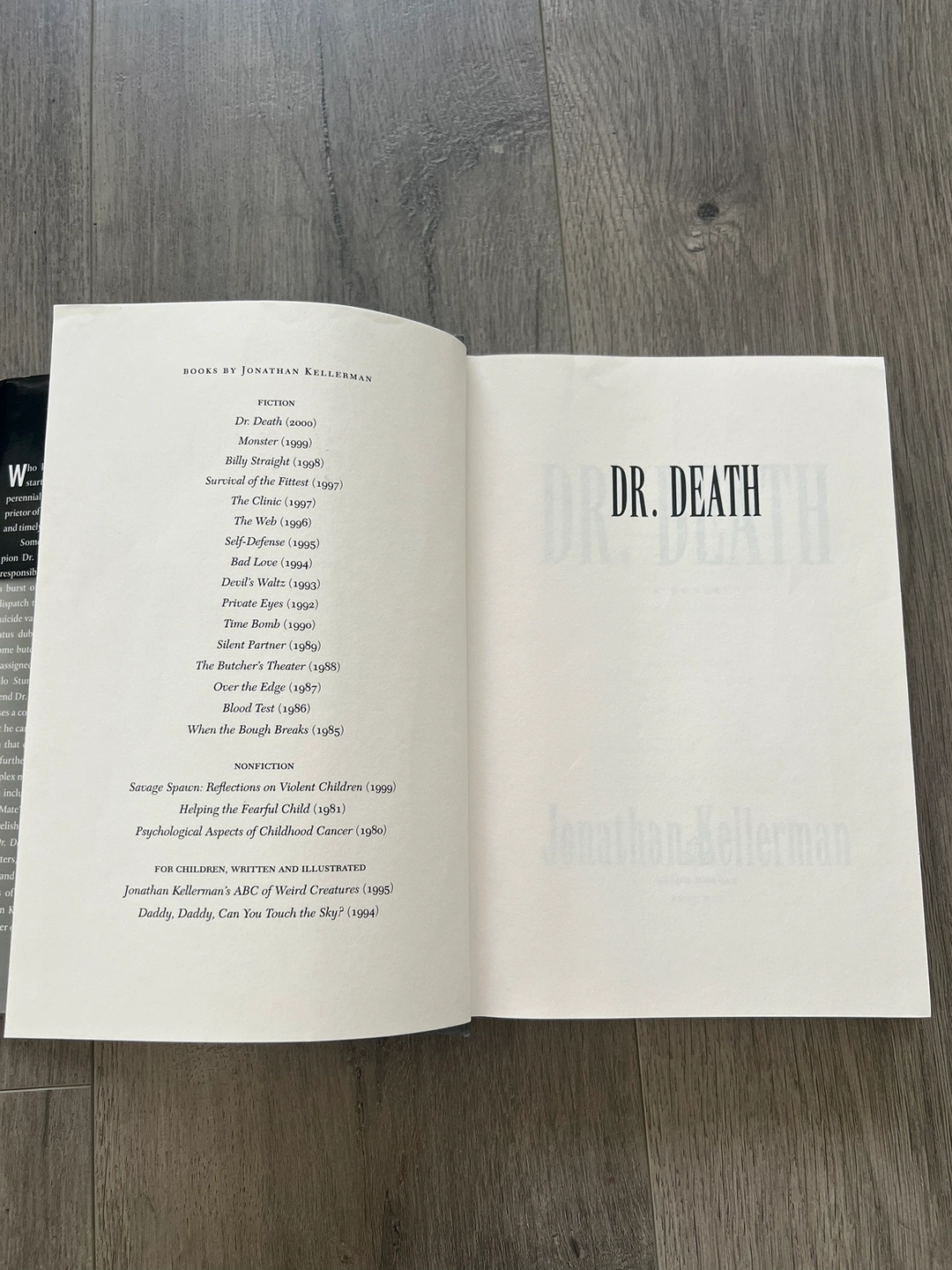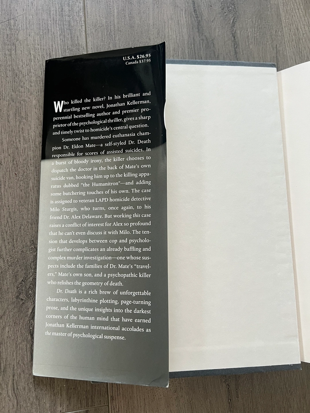 Who killed the killer? In this brilliant and startling psychological thriller, Jonathan Kellerman, perennial bestselling author, gives a sharp and timely twist to homicide's central question. Someone has murdered euthanasia champion Dr. Eldon Mate--a self-styled Dr. Death responsible for scores of assisted suicides. In a burst of bloody irony, the killer chooses to dispatch the doctor in the back of Mate's own suicide van, hooking him up to the killing apparatus dubbed the Humanitron--and adding some butchering touches of his own. The case is assigned to veteran LAPD homicide detective Milo Sturgis, who turns, once again, to his friend Dr. Alex Delaware. But working this case raises a conflict of interest for Alex so profound that he can't even discuss it with Milo. The tension that develops between cop and psychologist further complicates an already baffling and complex murder investigation--one whose suspects include the families of Dr. Mate's travelers, Mate's own son, and a psychopathic killer who relishes the geometry of death. Dr. Death is a rich brew of unforgettable characters, labyrinthine plotting, page-turning prose, and the unique insights into the darkest corners of the human mind that have earned Jonathan Kellerman international accolades as the master of psychological suspense. This description may be from another edition of this product.