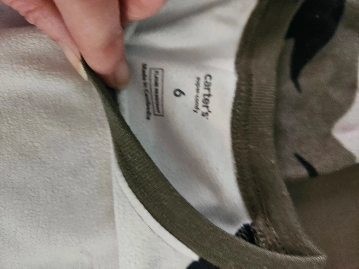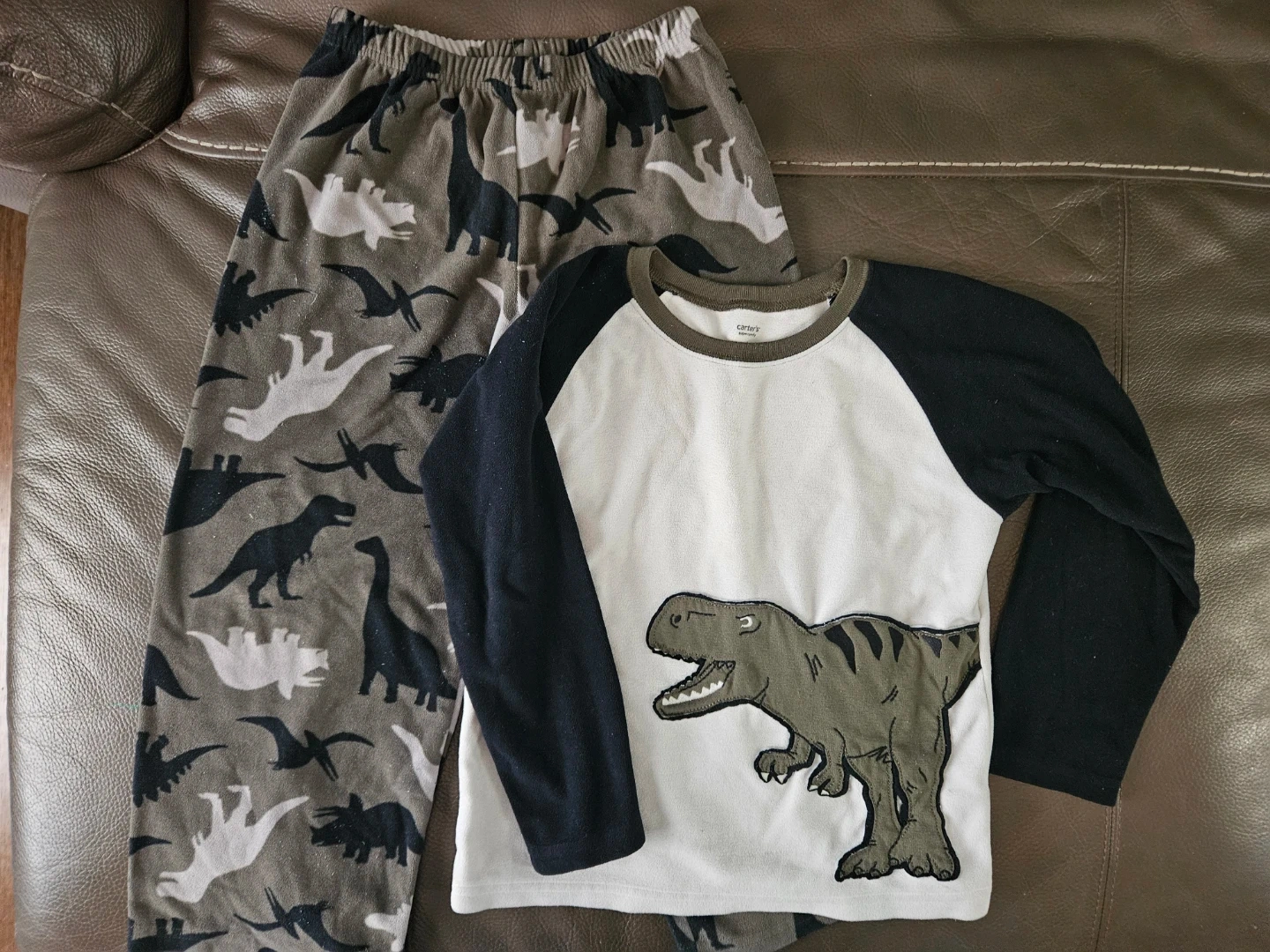 Here's a cute pajama set from Carter's! The set includes a long-sleeved shirt and pants, both size 6. The pants feature a fun dinosaur print, and the shirt has a dinosaur applique. Perfect for your little dino lover!