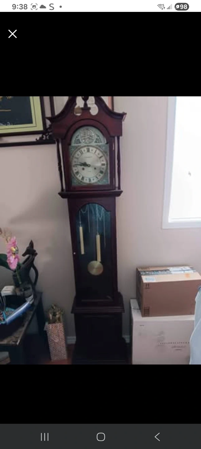 Beautiful mahogany grandfather clock with a traditional design. It features a brass pendulum and weights. This clock adds an elegant touch to any room!