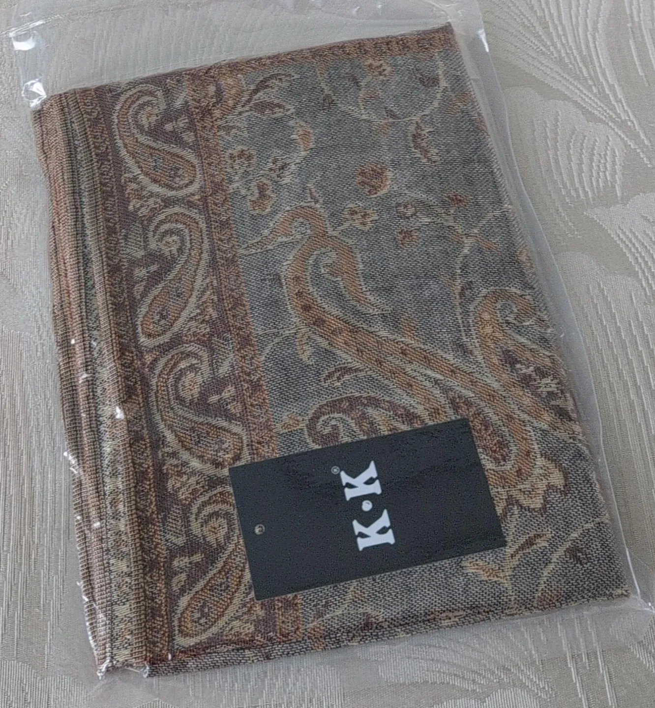 This K.K. shawl has a classic paisley print. It's wrapped in protective plastic. The colours are neutral tones of brown and grey.