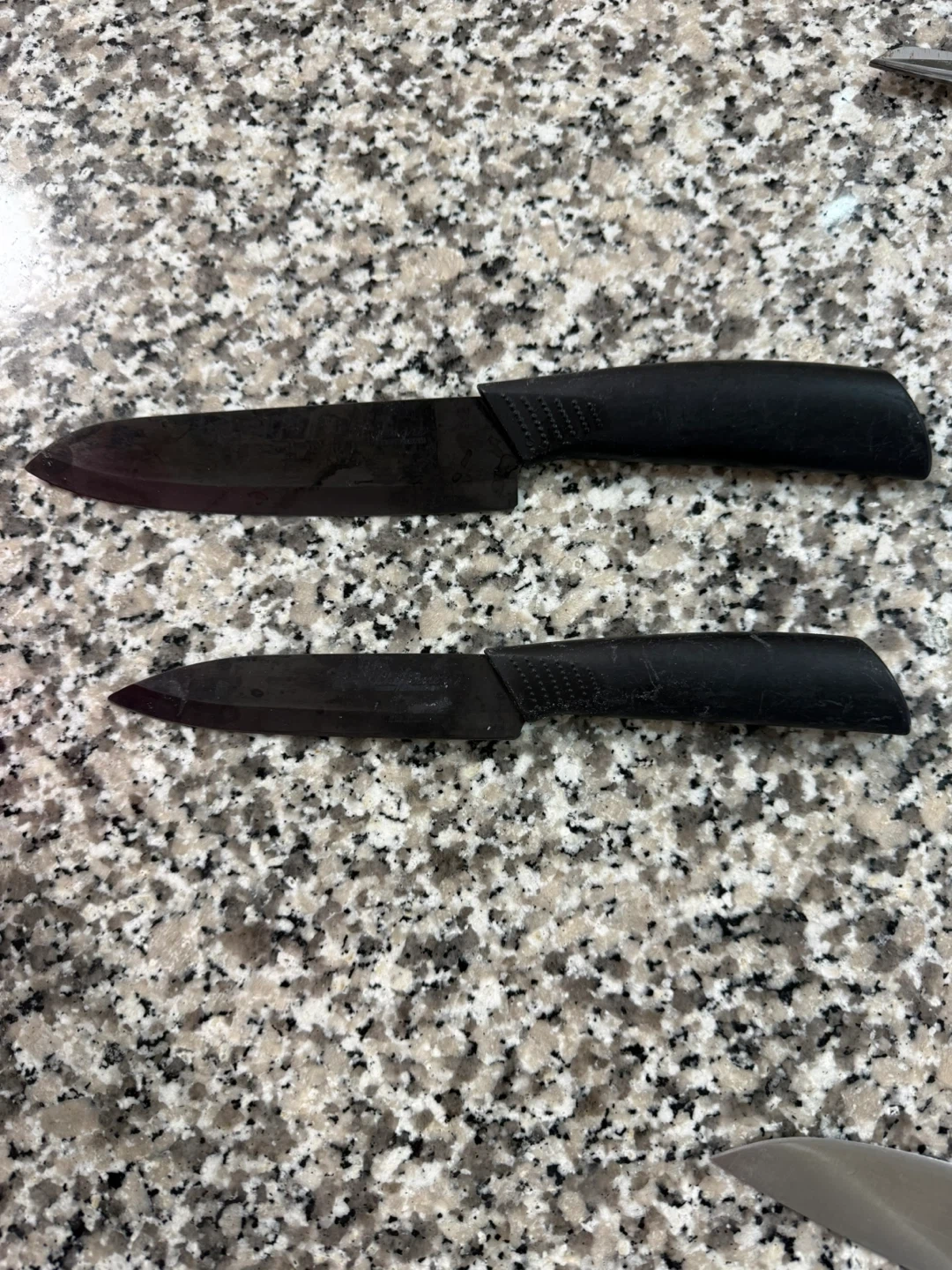Two black kitchen knives with black handles. Blades are smooth and made of metal. Handles are textured for grip. They're good for general kitchen prep work.