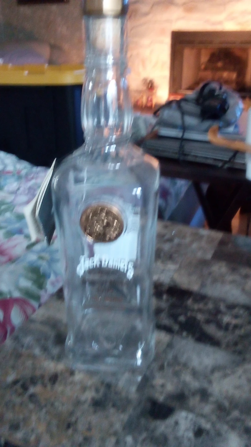 Empty Jack Daniel's glass bottle. It's clear glass with the signature label and emblem. Perfect for display or repurposing!
