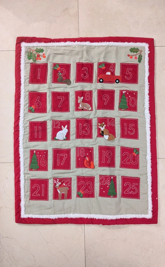 Pottery Barn Kids advent calendar with 25 pockets for each day. Woodland animal themed with white fur trim. The back of the calendar includes two metal rings for hanging. Excellent condition.