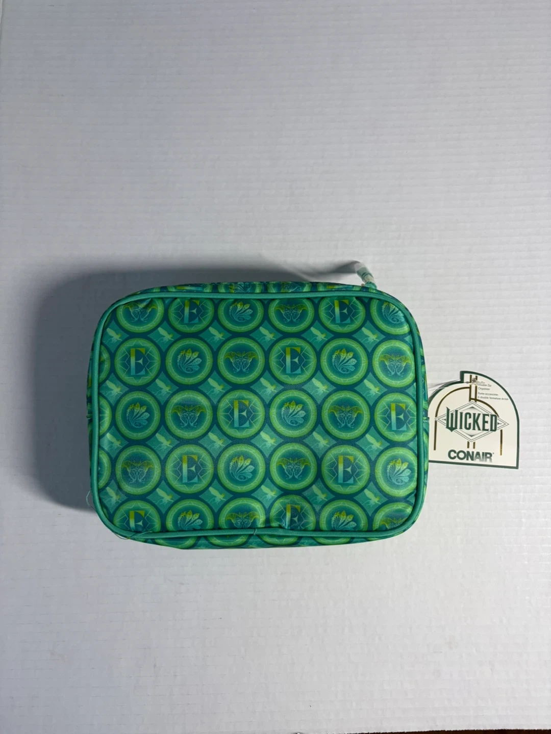 This Conair Wicked travel pouch is perfect for organizing small essentials. It features a vibrant green pattern with gold accents and a zippered closure. Measures approximately 6" x 4" x 3".