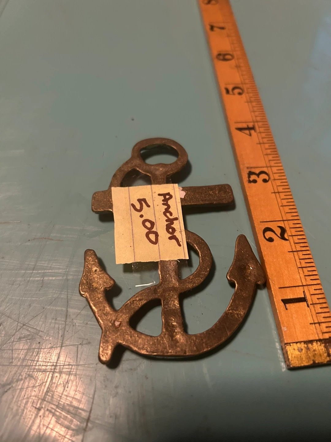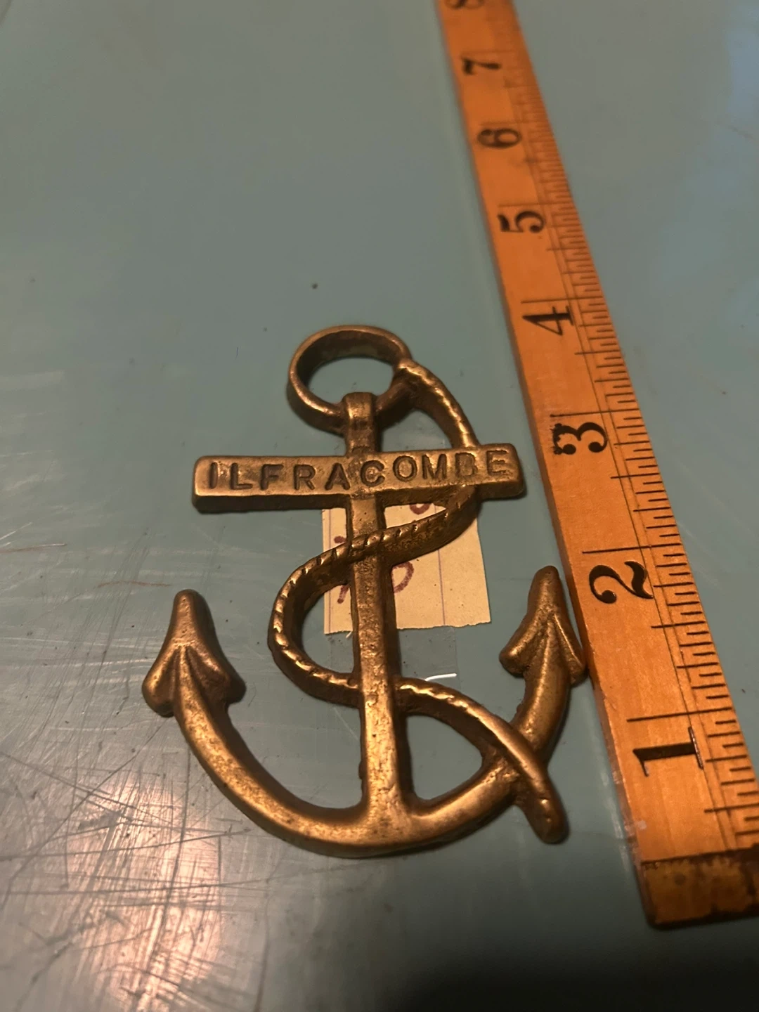 This is a decorative anchor, likely made of brass, with 'Ilfracombe' engraved on a banner. It appears to be a souvenir item. The ruler in the photo indicates it's roughly 5 inches tall.