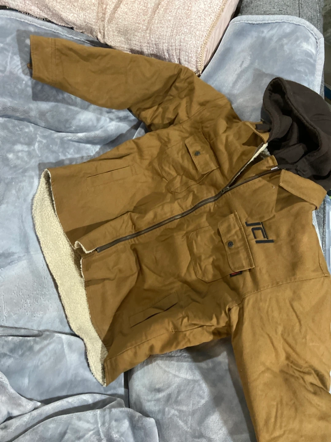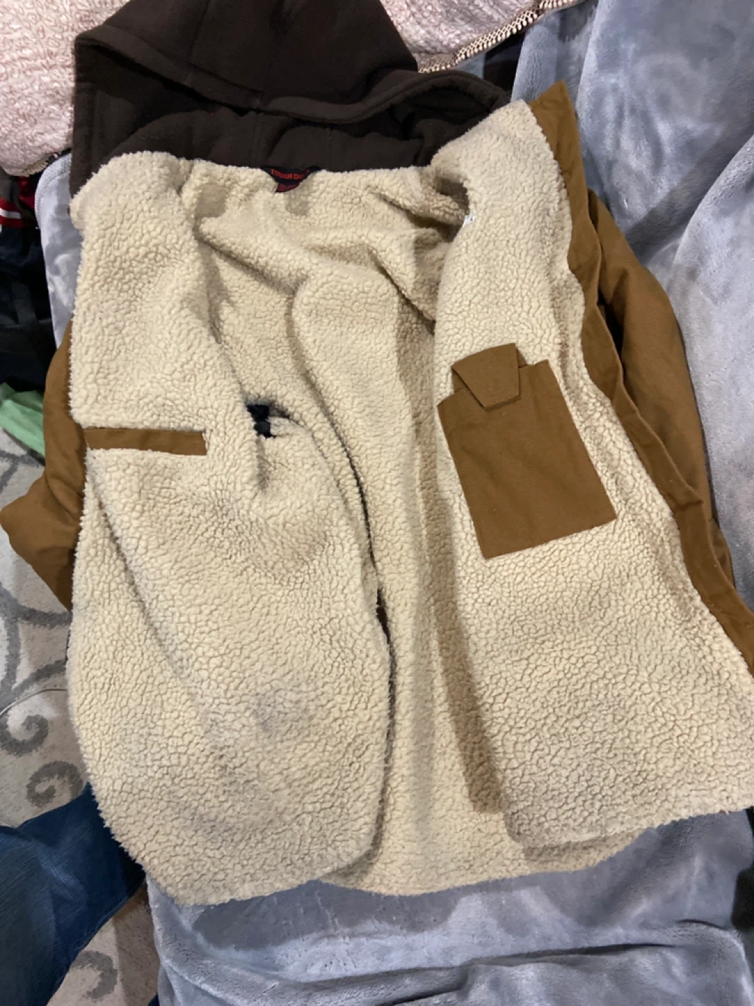 This Tough Duck jacket features a sherpa lining for extra warmth. It's a size 2XL/2TG. Made in Bangladesh. Great for outdoor work.