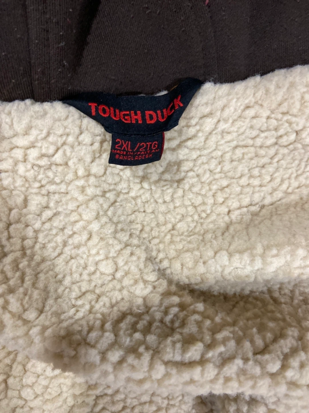 This Tough Duck jacket features a sherpa lining for extra warmth. It's a size 2XL/2TG. Made in Bangladesh. Great for outdoor work.