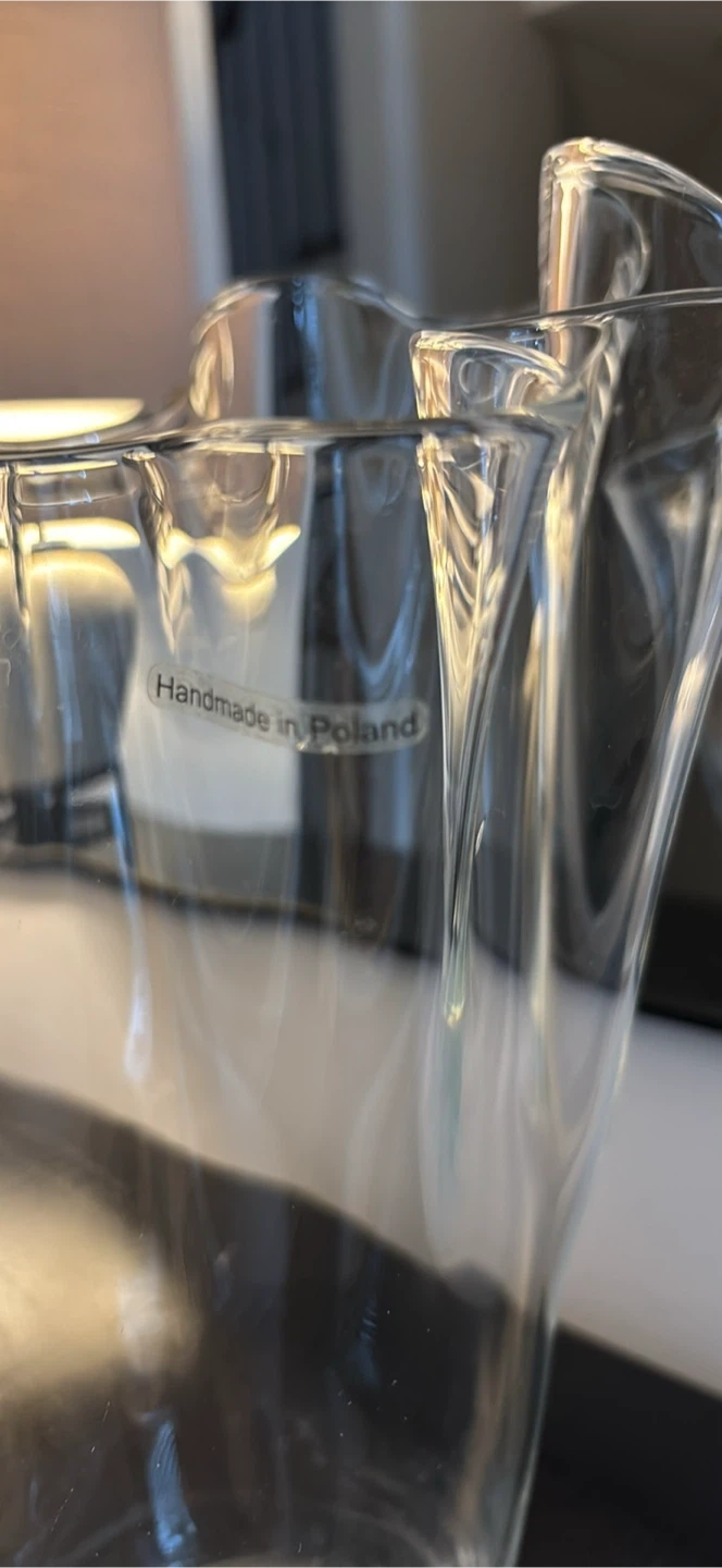 Beautiful clear glass vase, handmade in Poland! It's a lovely piece to add to your home decor, perfect for displaying flowers or as a standalone art piece