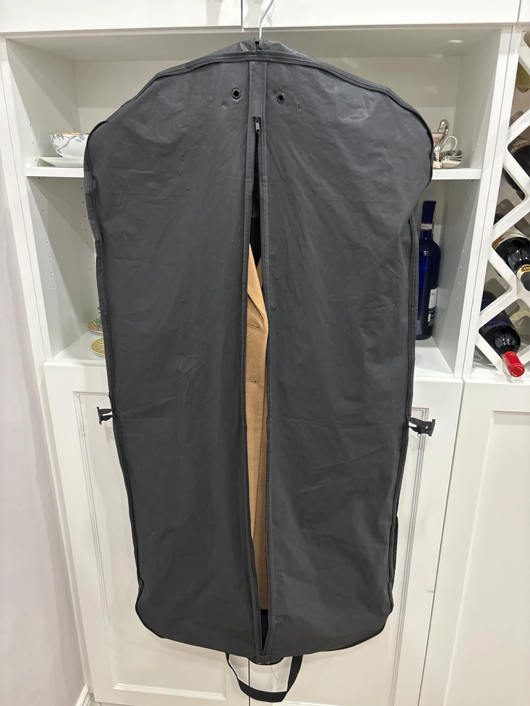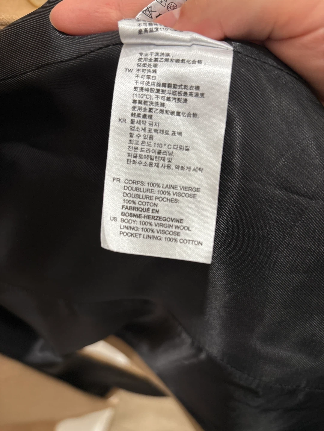 Camel coloured wool blend coat. Double-breasted style with button closure. US Body: 100% Virgin Wool, Lining: 100% Viscose, Pocket Lining: 100% Cotton. Size 36.