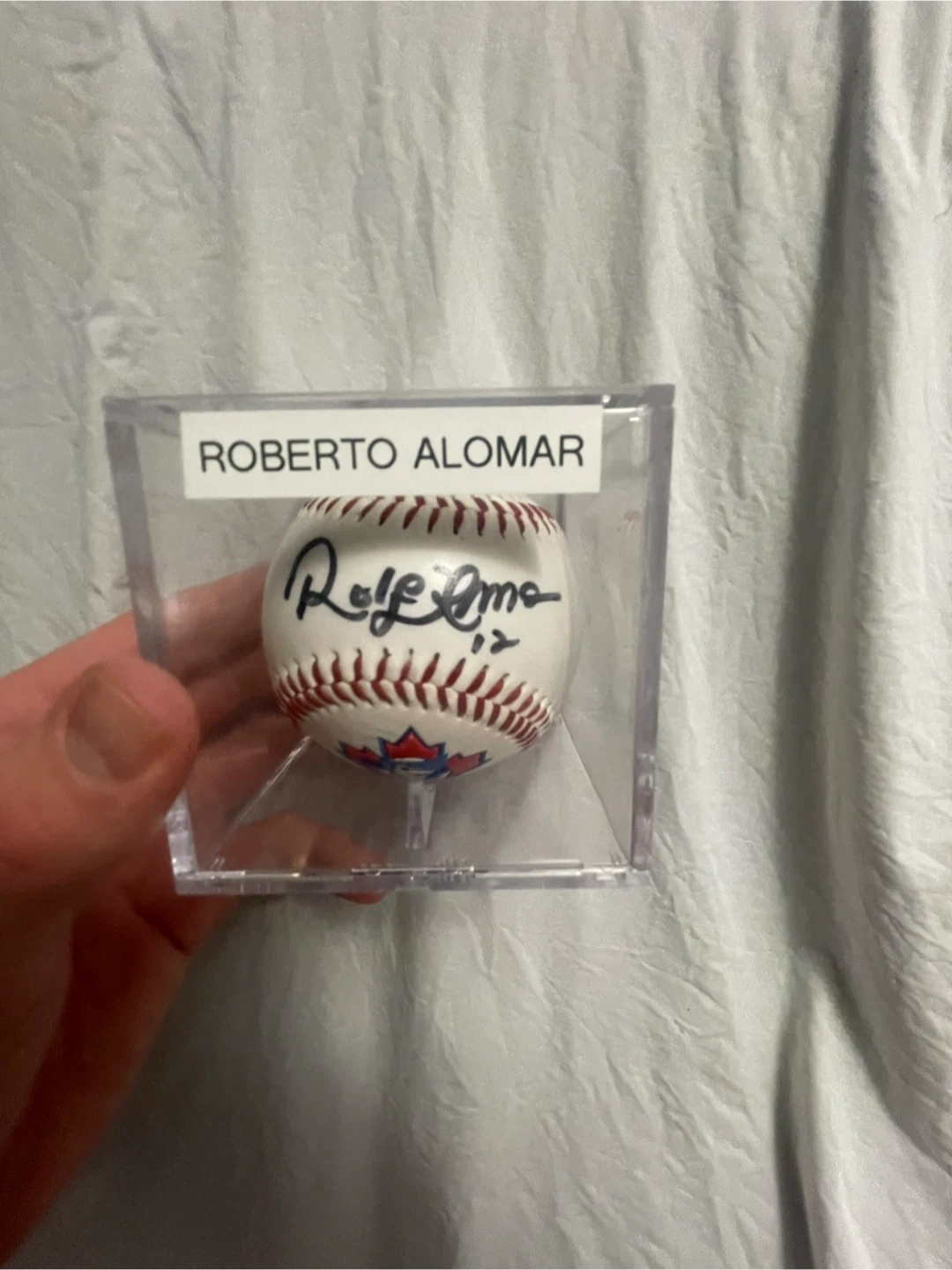 This is a baseball autographed by Roberto Alomar. It comes in a protective display case. This would be a great addition for any baseball memorabilia collector!