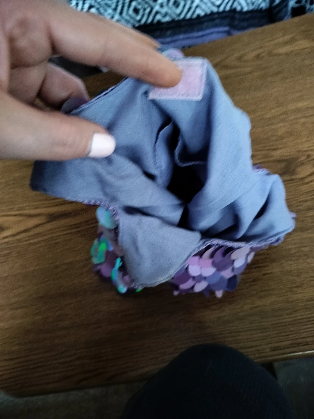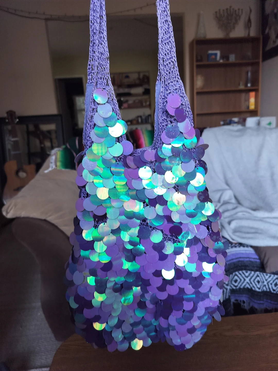 This fun purple bag is covered in iridescent purple and teal sequins! It's perfect for carrying essentials or as a sparkly accessory. The bag has a fabric lining, an inside pocket and crochet-style straps.