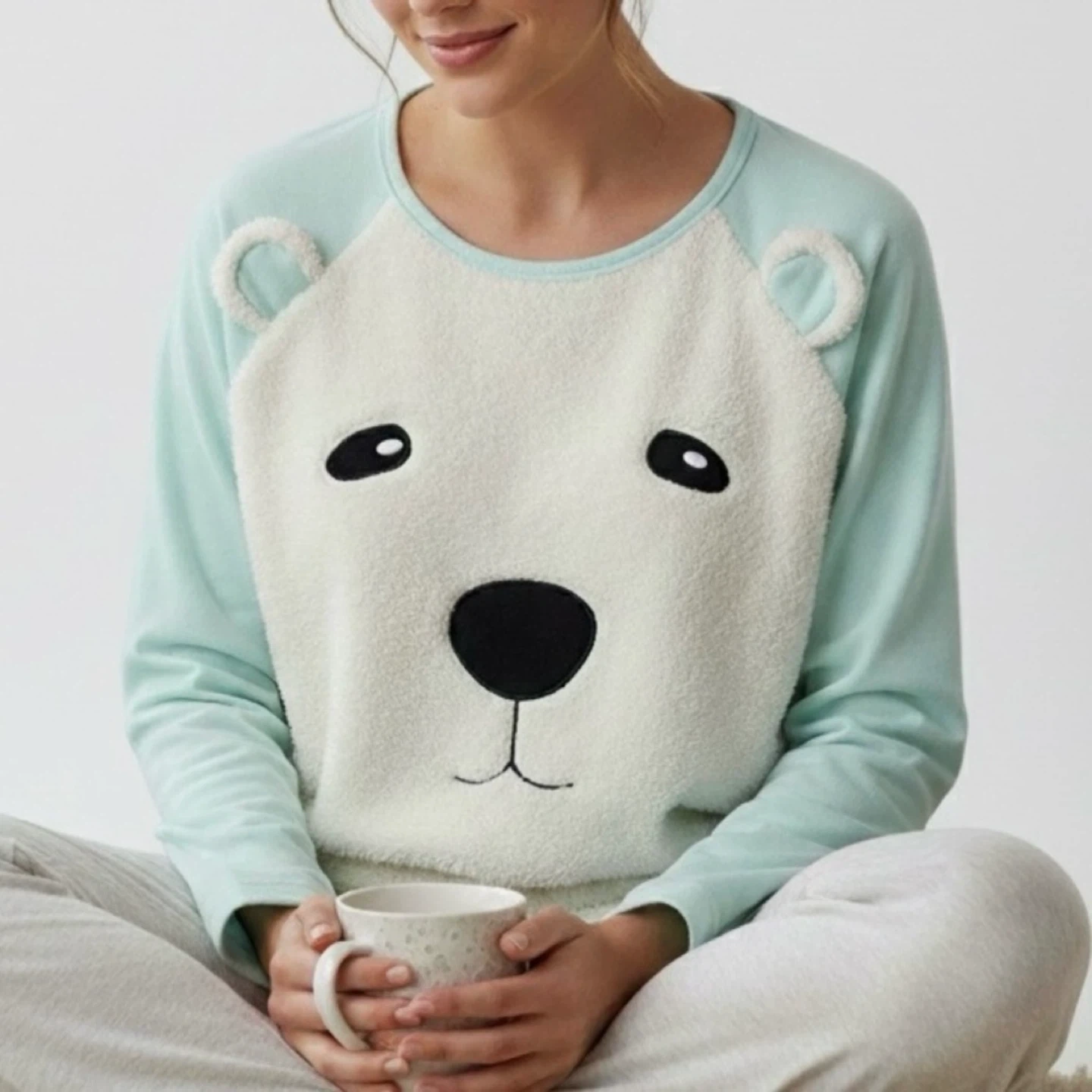 Cozy and cute long-sleeve fleece pajama top featuring an embroidered polar bear face with fuzzy 3D ears on a mint/aqua blue raglan sleeve background. Perfect for cold weather lounging and bedtime comfort.