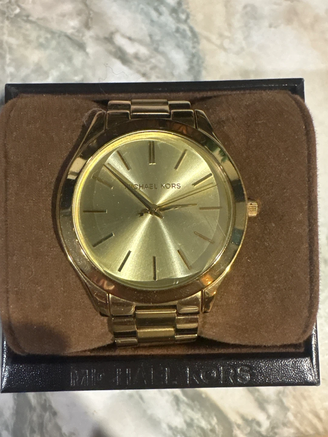 This is a Michael Kors watch with a gold-tone finish. It features a classic dial and a metal link band. Includes original box and extra links. Needs new batteries