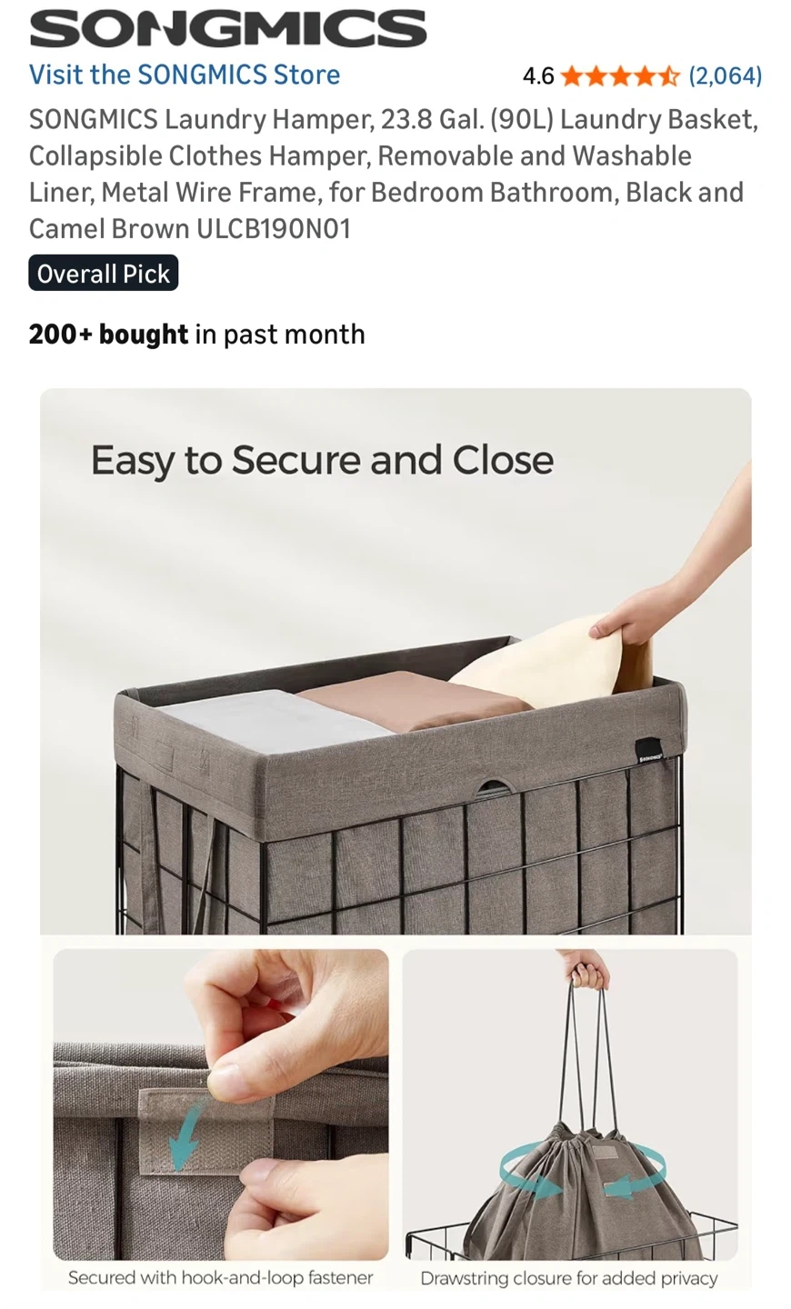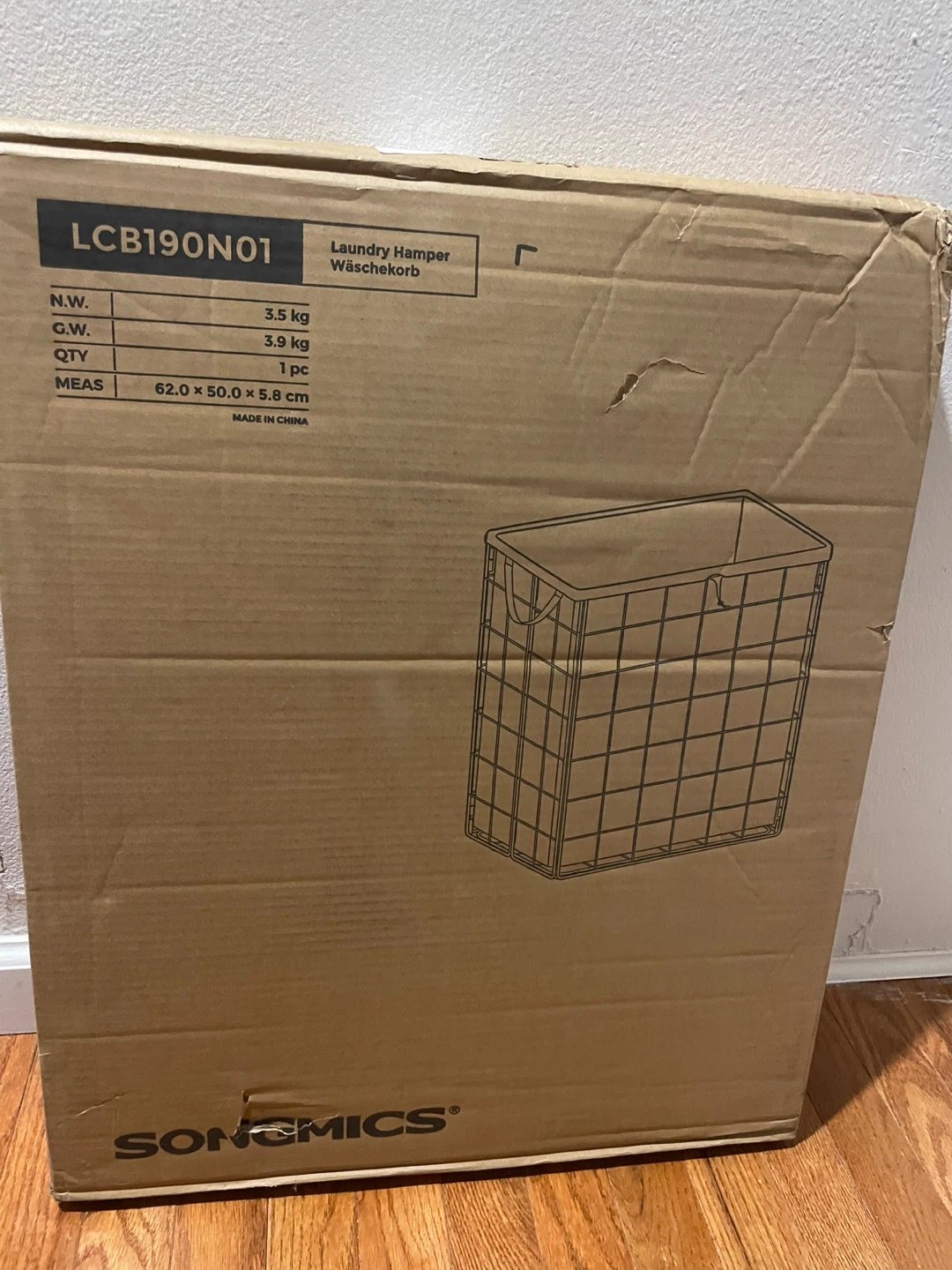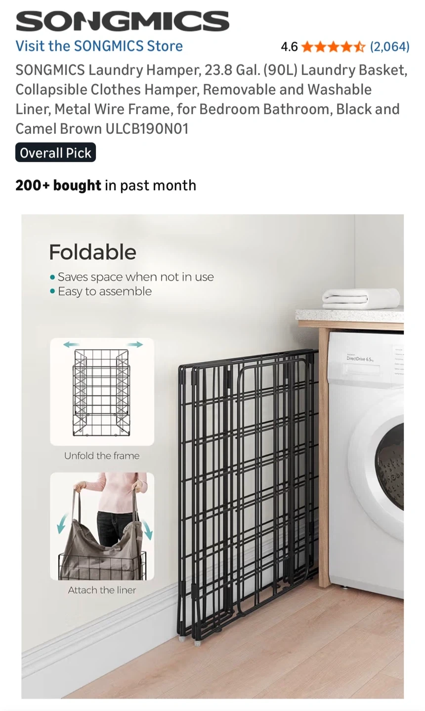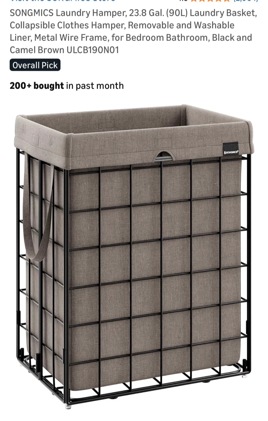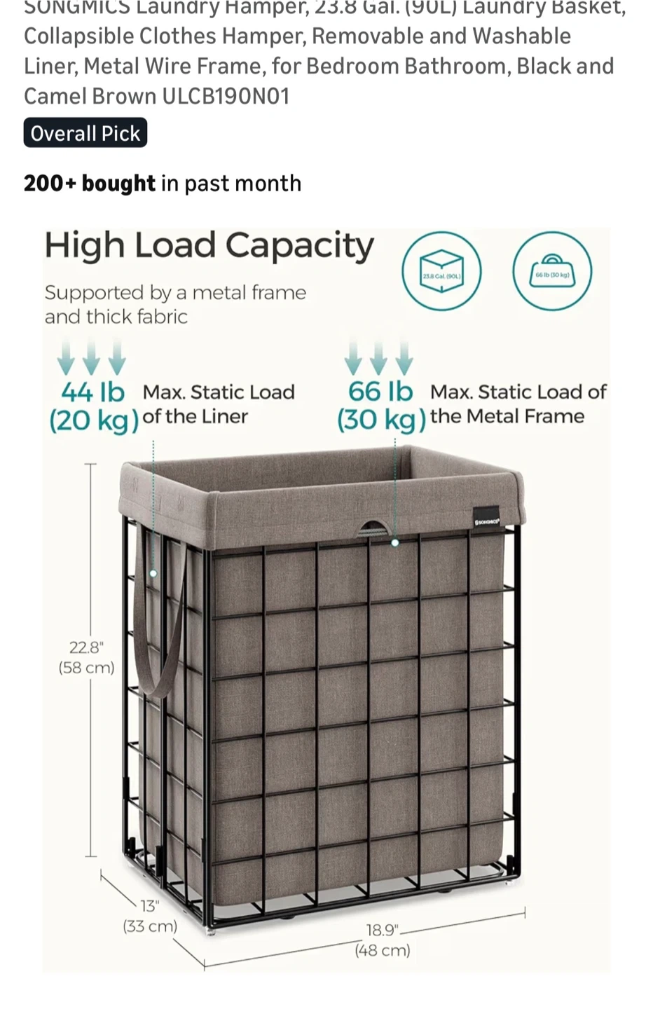 This laundry hamper is 23.8 Gal (90L) and features a removable and washable liner. It's constructed with a metal wire frame and measures 22.8" H x 18.9" W x 13" D. The hamper is collapsible for easy storage when not in use. Brand new in box.