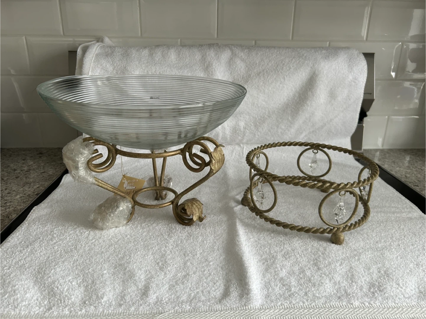Never used. Create two different looks. 1 clear ribbed bowl, 2 metal bases. Wrought iron bases are light gold/ivory colour. Base with crystal-like hanging gems is 4” tall. Base with leaf accents is 6” tall. Bowl is 11” wide, 3.5” tall. Some bubble wrap still attached. 3 pieces for $25. Brampton, near Queen and Kennedy.