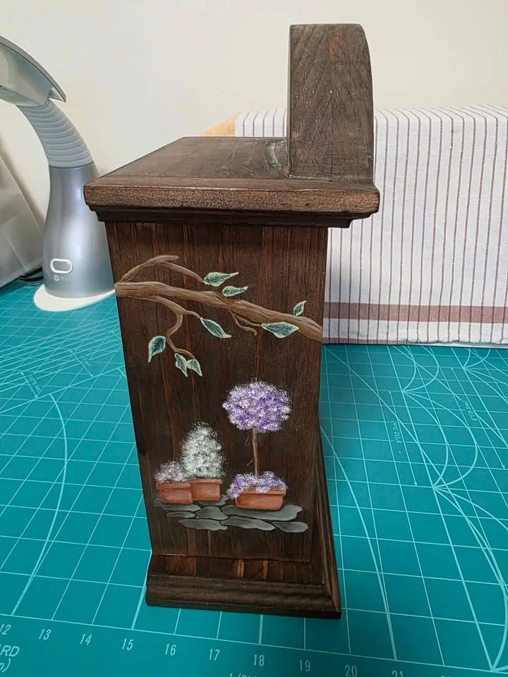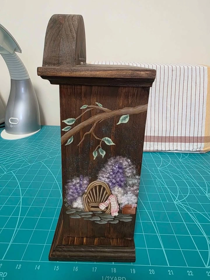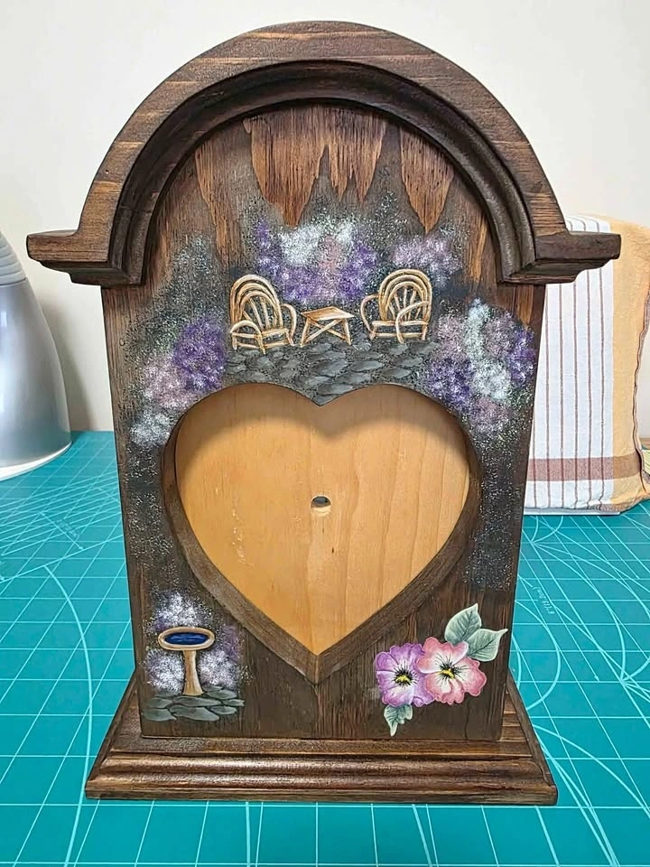 Folk Artist's Standing Clock Project to Finish. Stained dark brown. Three finished painted sides in a garden theme. Just needs to be varnished and you paint the clock face with pattern included. Removable panel just needs to be screwed into place. Needs a clock mechanism. 13'" tall x 9" wide x 5" deep. Would be really pretty in a sun room or cottage. Smoke/pet free home. Pick up in west end of Peterborough. $10