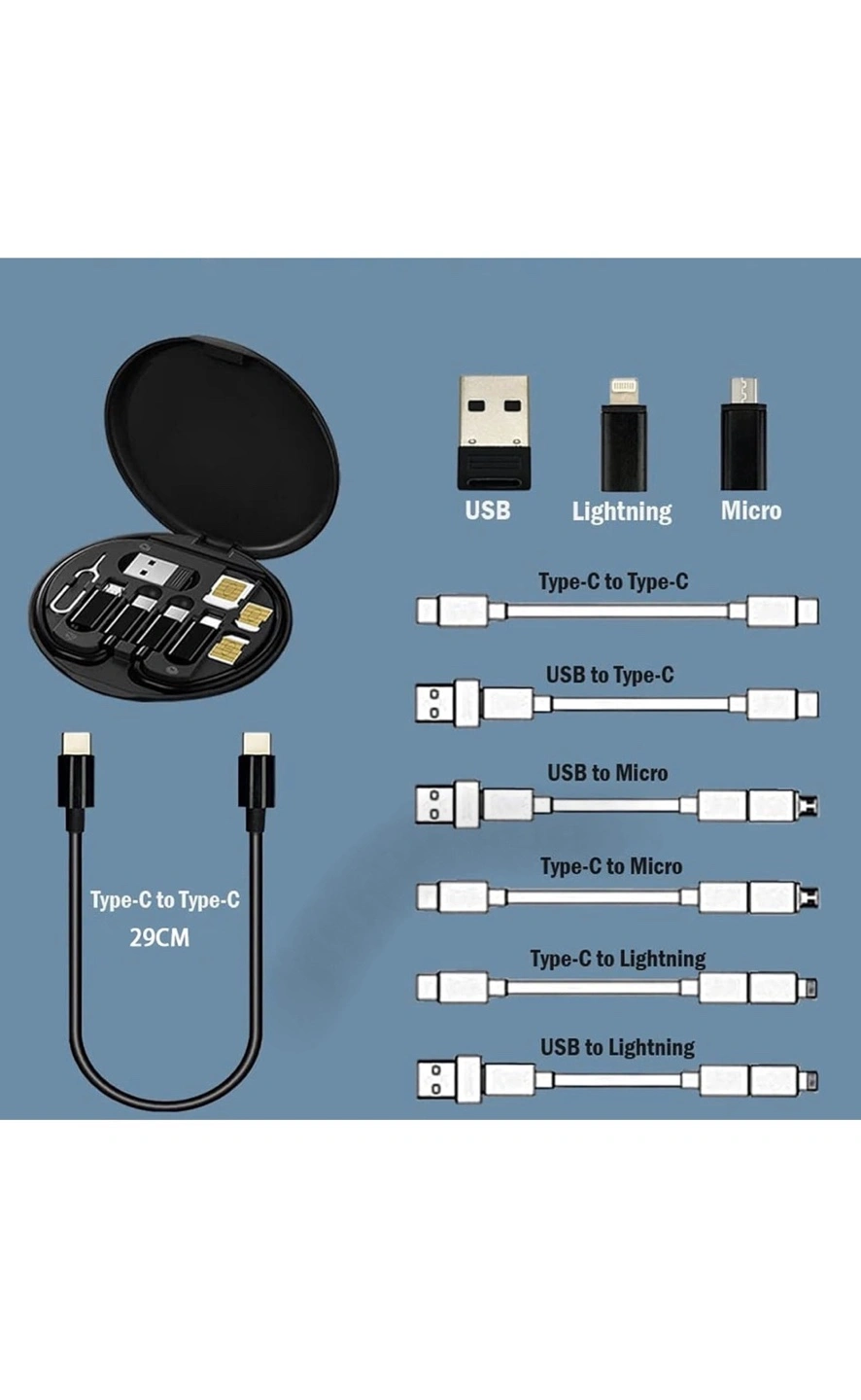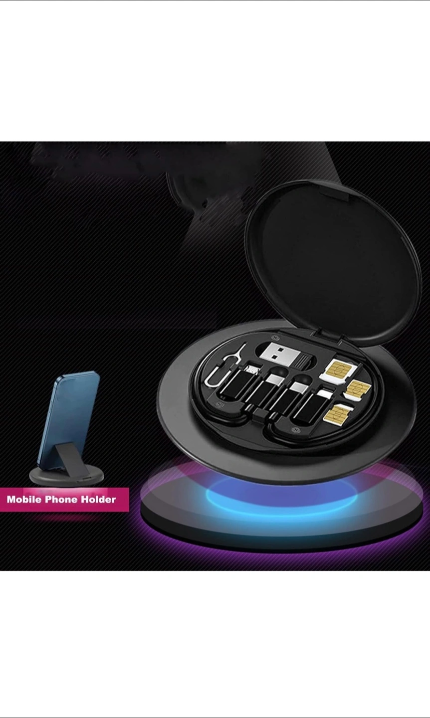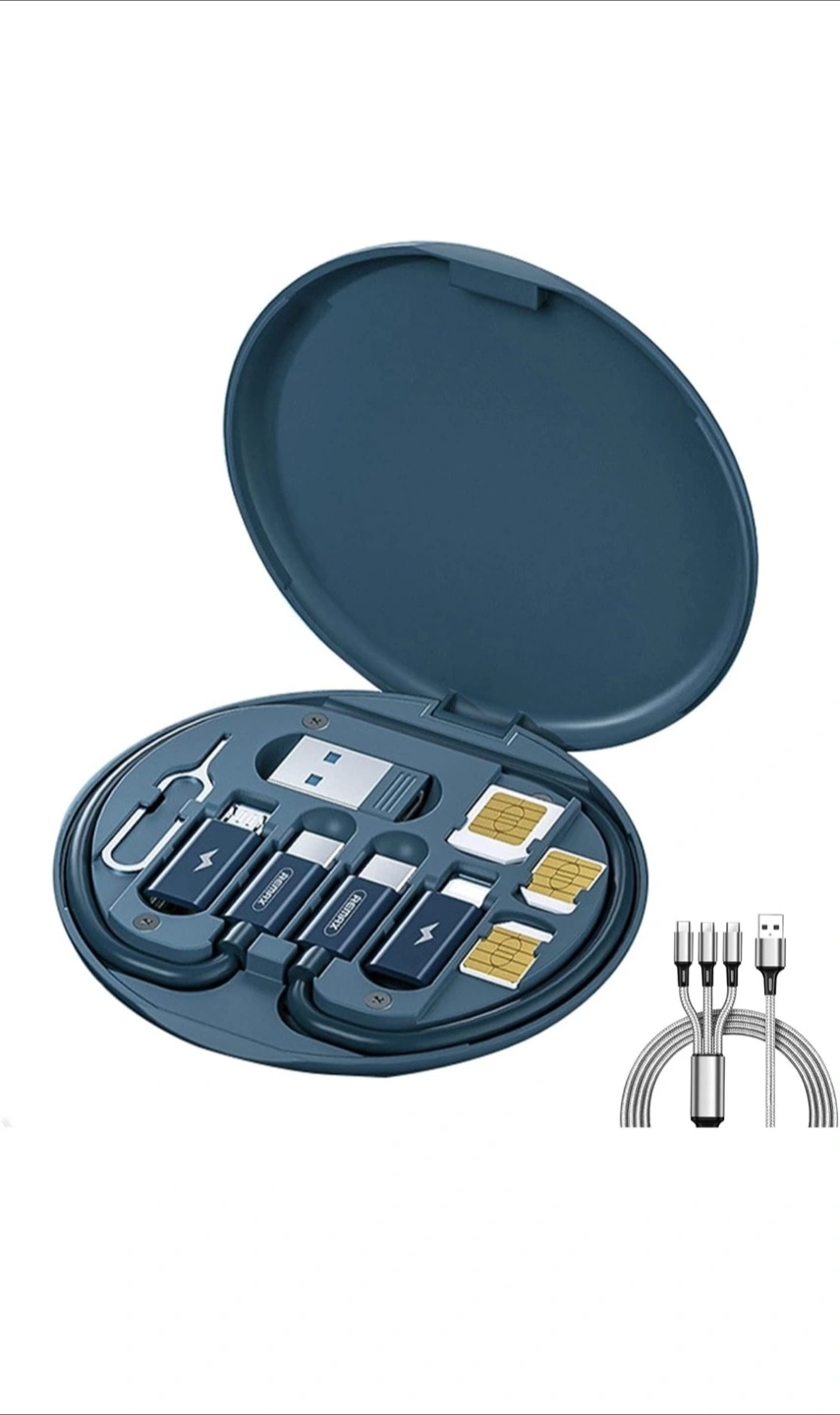 This handy charging kit includes multiple cable types and adapters in a compact case. It also comes with a SIM card ejector tool and a built-in phone stand. Great for travel or everyday use!