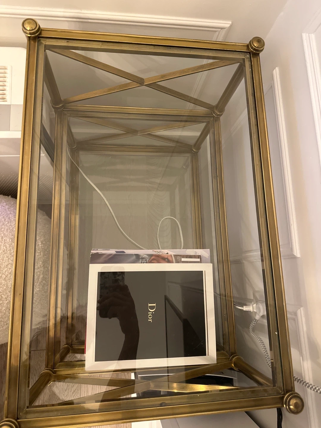 This is a stylish side table with a brass frame and glass shelves. It's perfect for placing beside a couch or bed. The table has a modern design and offers two tiers of storage.