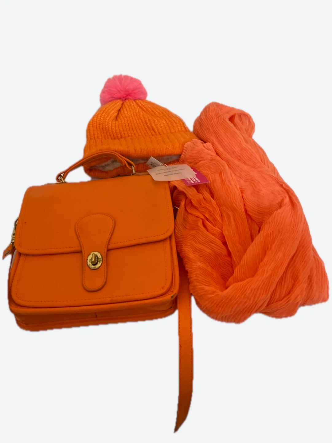 A vibrant orange leather crossbody handbag with a gold clasp closure. It's paired with a matching orange knit beanie hat featuring a pink pom-pom. The set also includes a lightweight crinkled orange scarf. Perfect for adding a pop of color to any outfit!